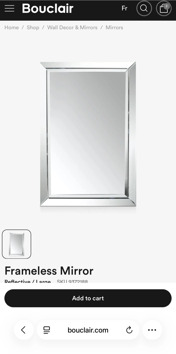 Selling 2 Bouclair frameless mirror in a reflective silver finish. Excellent beside your bed. Few small scratches on the back( none on the front) I’ve kept it wrapped for more protection, but can remove if buyer is interested. They look like the picture.