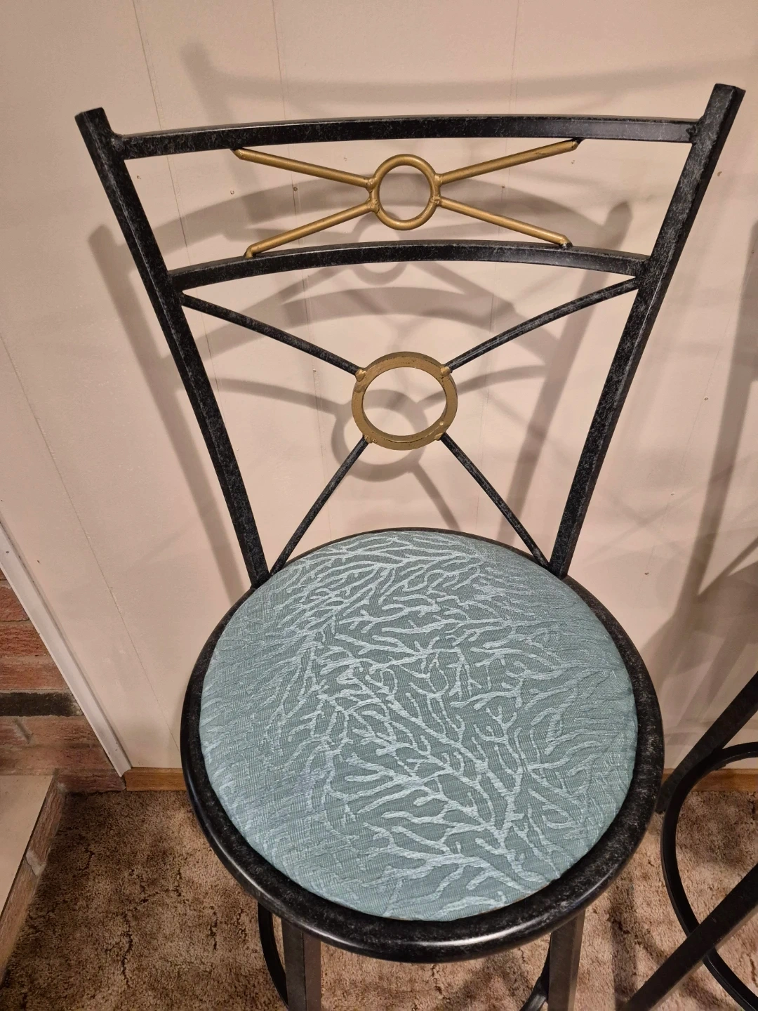 Selling a set of two bar stools with a metal frame and a teal patterned seat. They're in great condition and would look great in any kitchen or bar area!