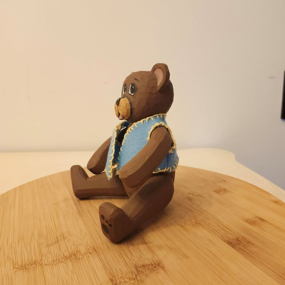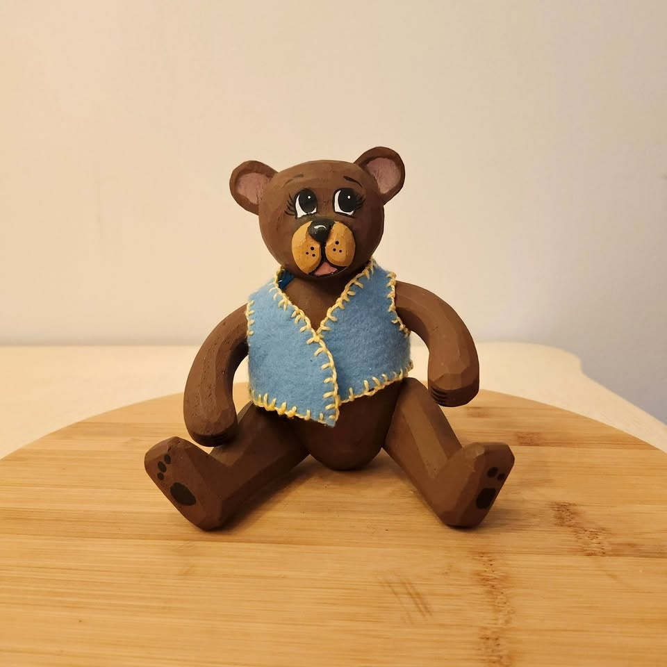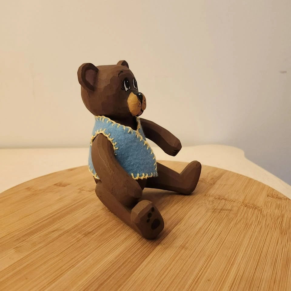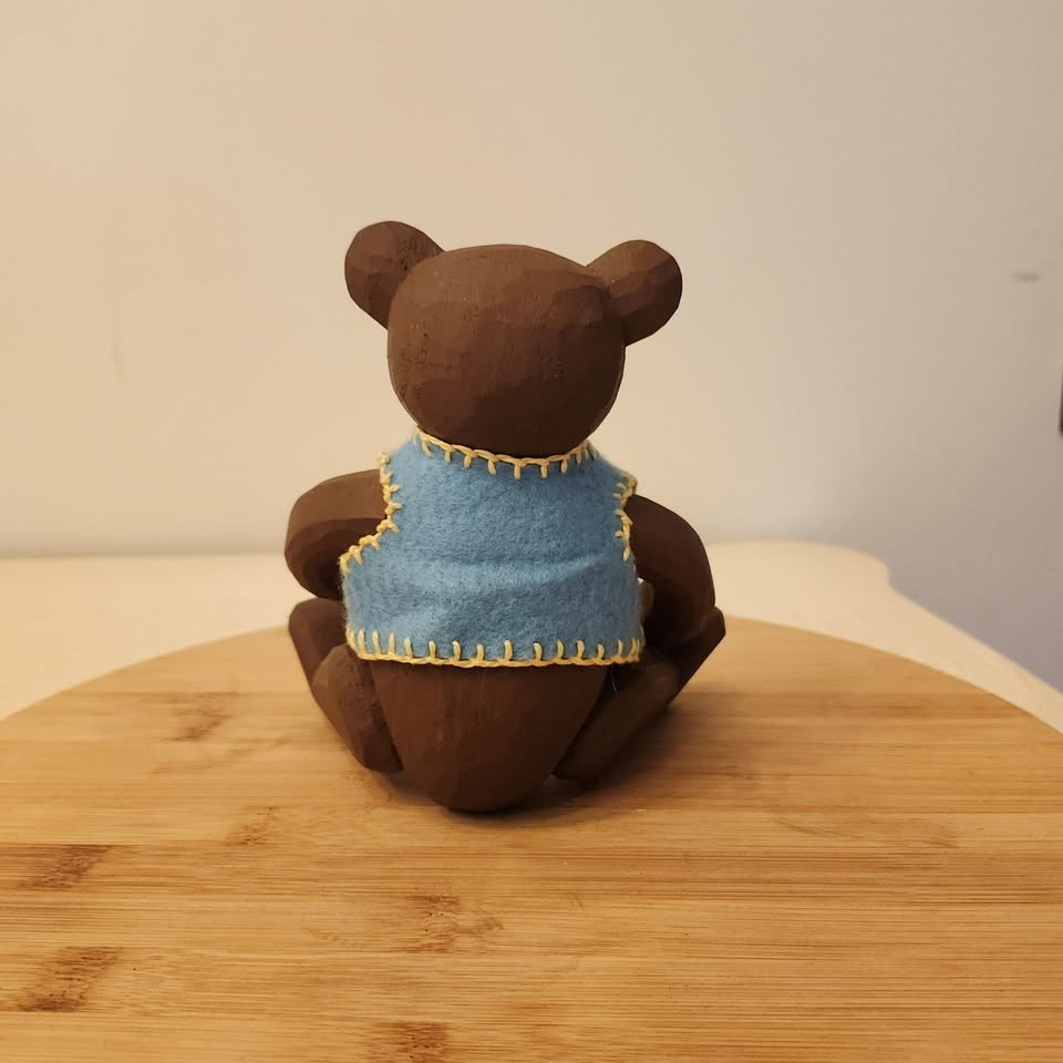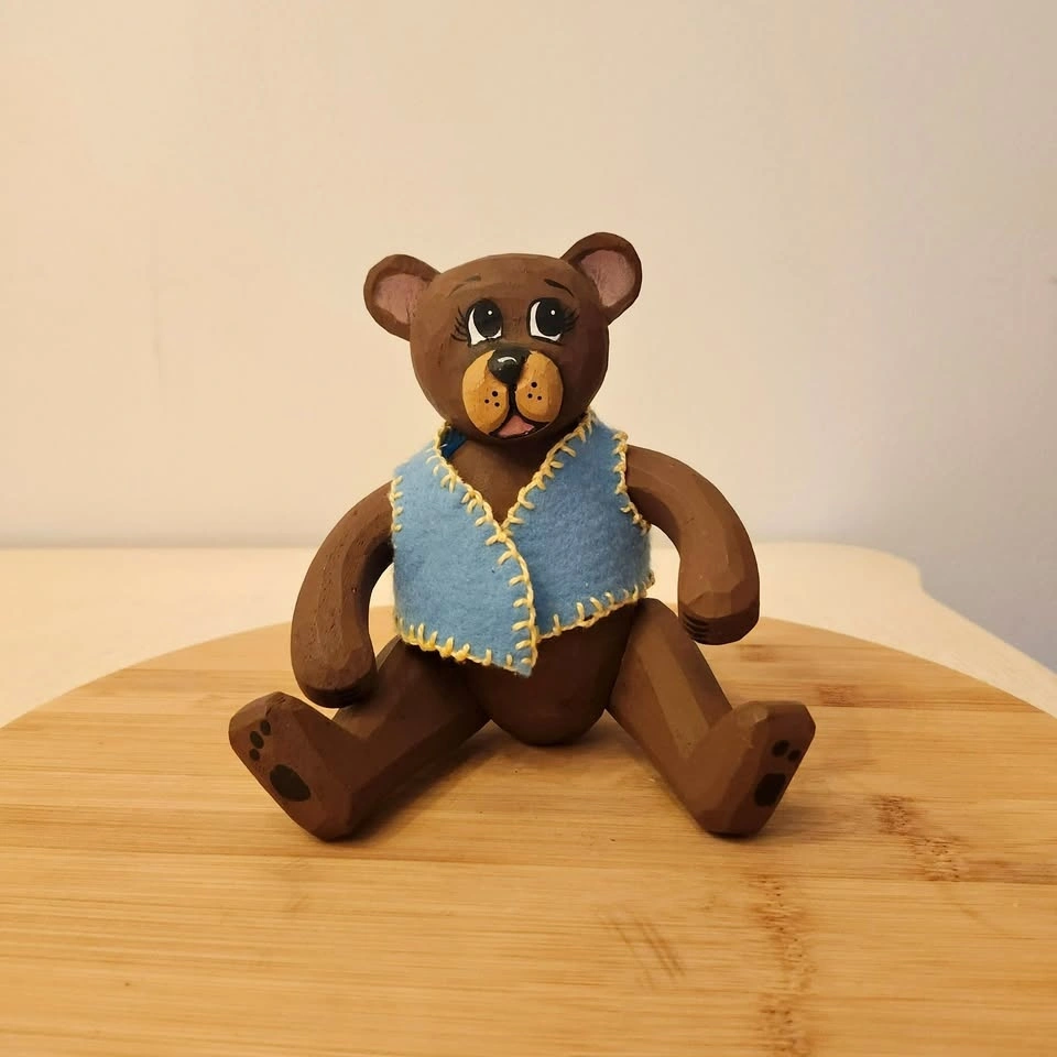You won't see too many of these bears around! It's a carved folk art bear with adjustable arms and legs and little blue felt vest.
