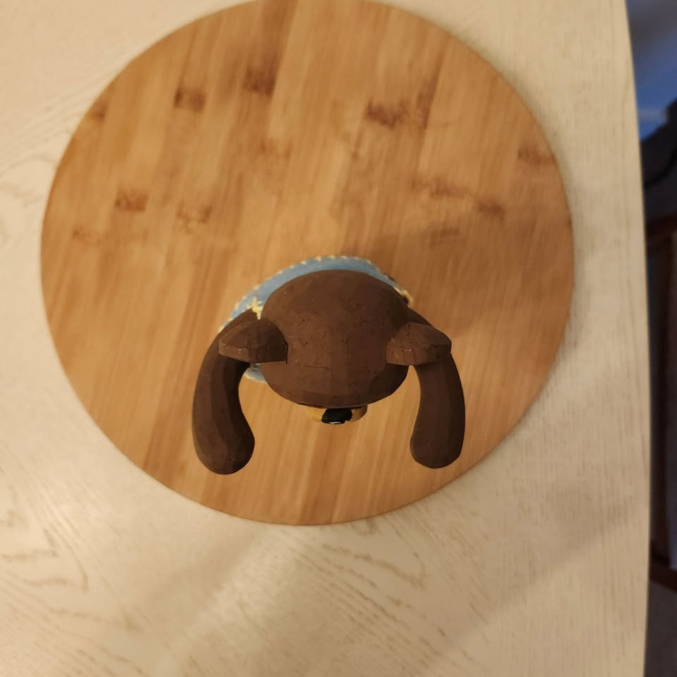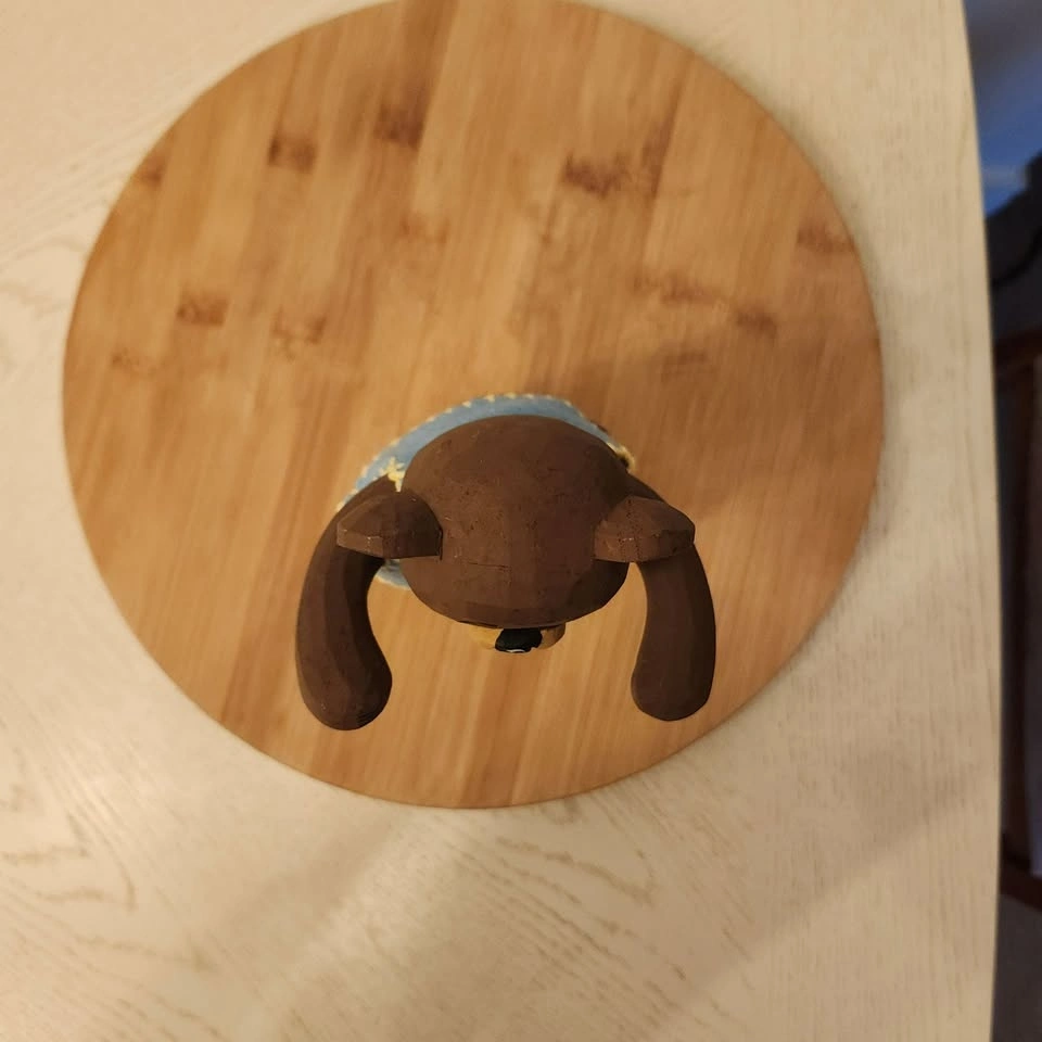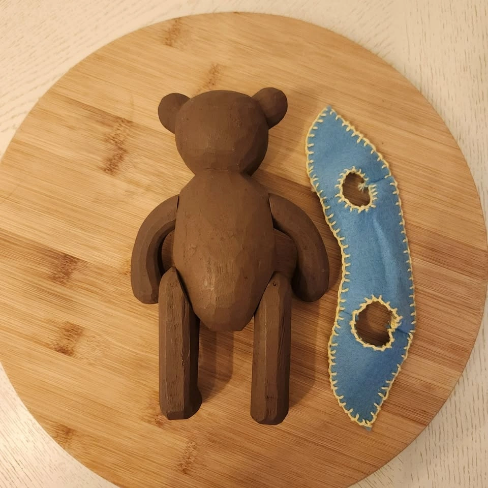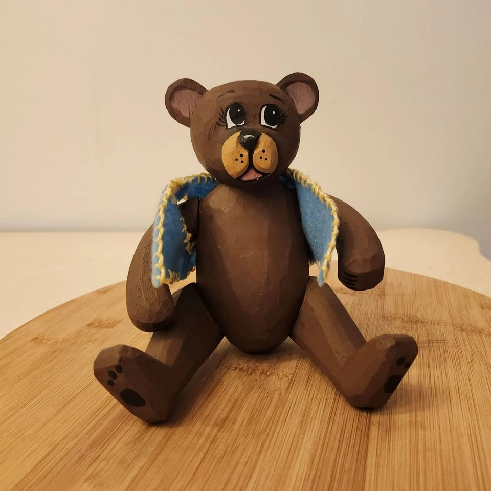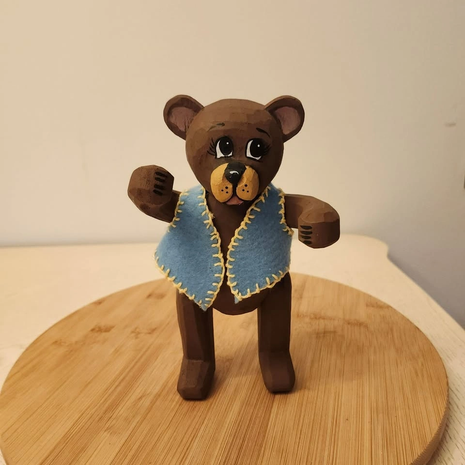 You won't see too many of these bears around! It's a carved folk art bear with adjustable arms and legs and little blue felt vest.