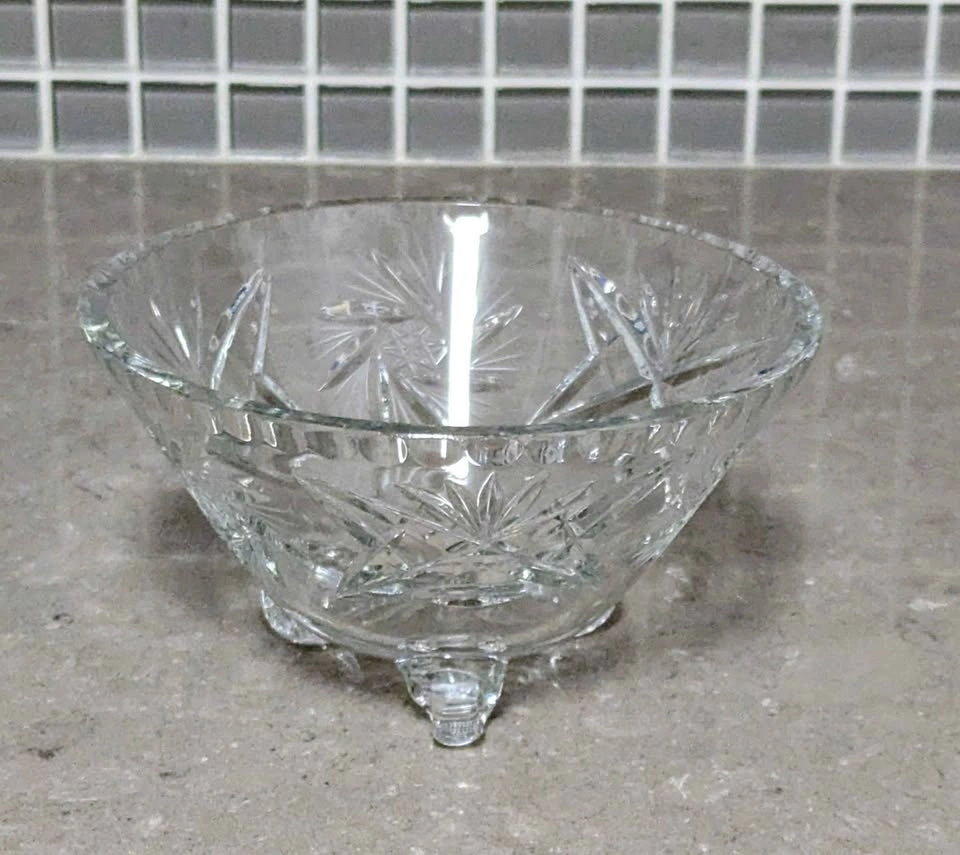 Beautiful vintage Anchor Hocking clear glass bowl in the popular Early American Prescut (EAPC) "Star of David" pattern. This charming piece sits on three small feet and features intricate cut glass designs.