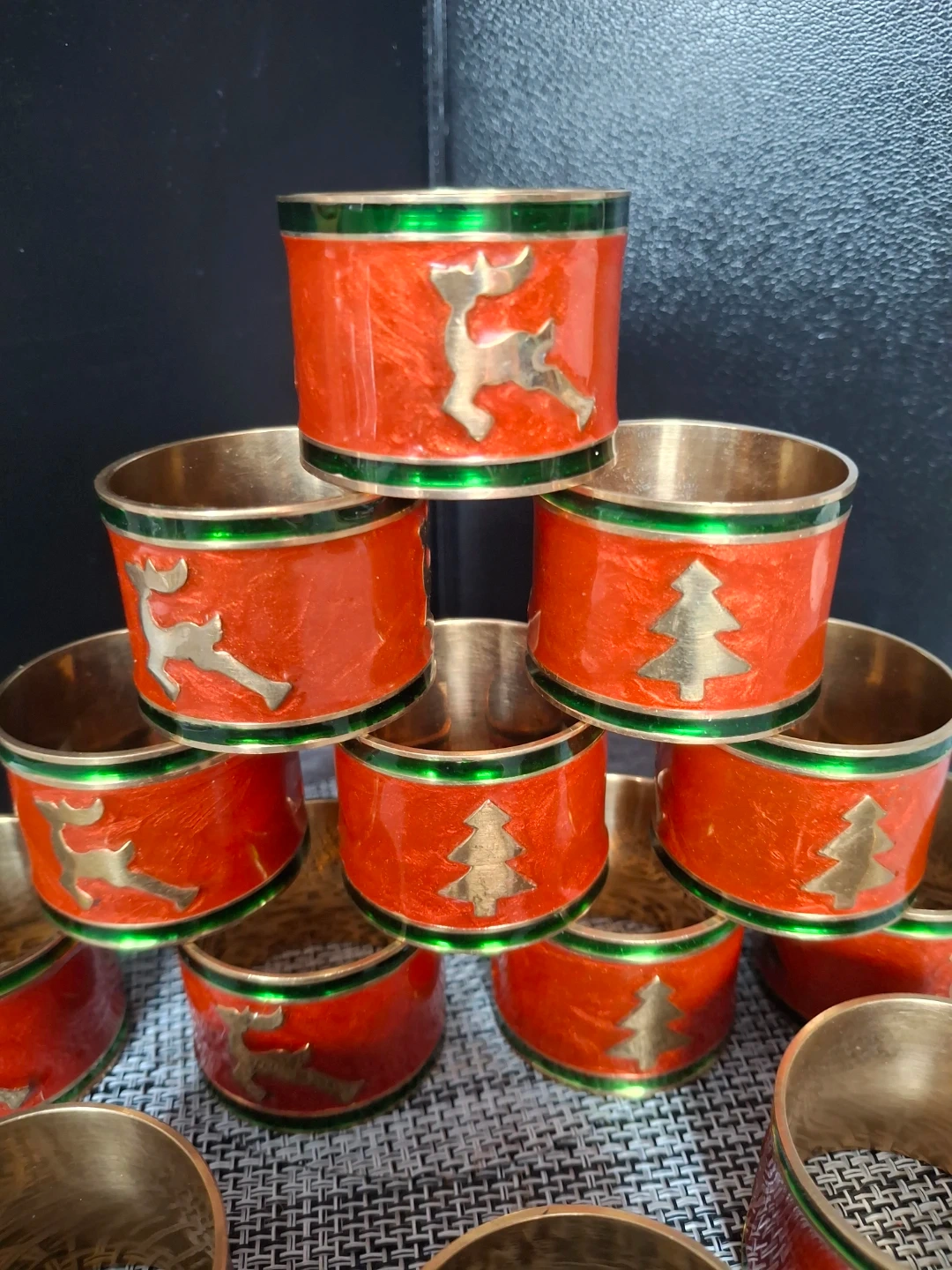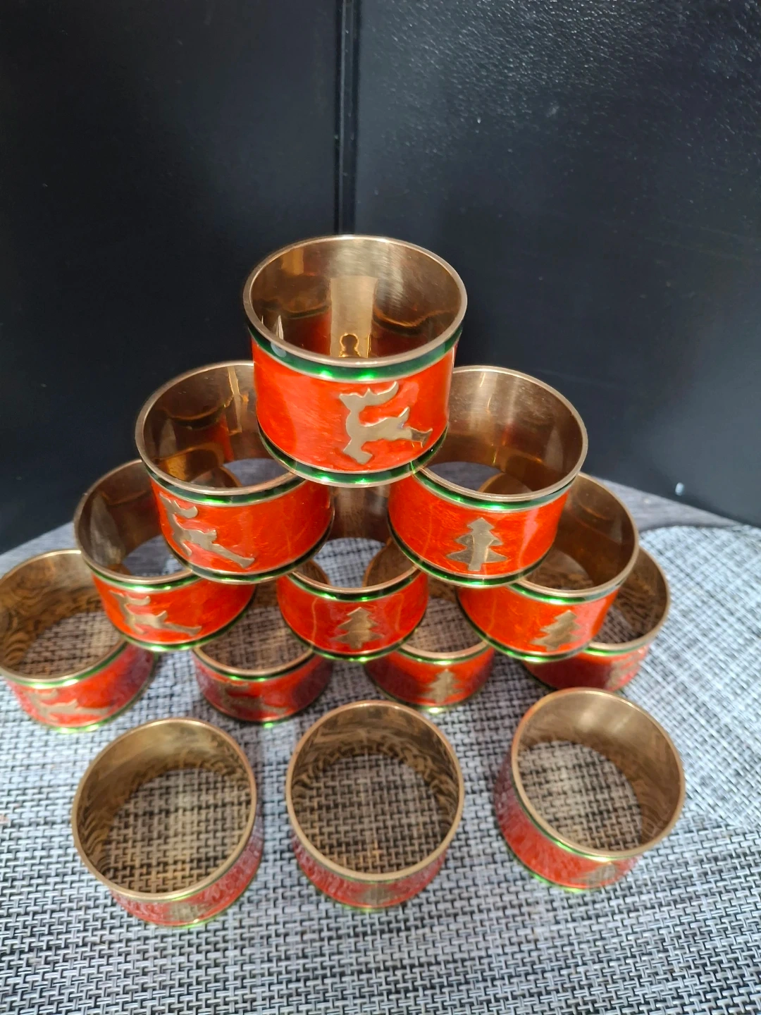 You'll get a set of 13 napkin rings, perfect for the holidays! They're orange with gold accents and feature a reindeer and Christmas tree design around the outside