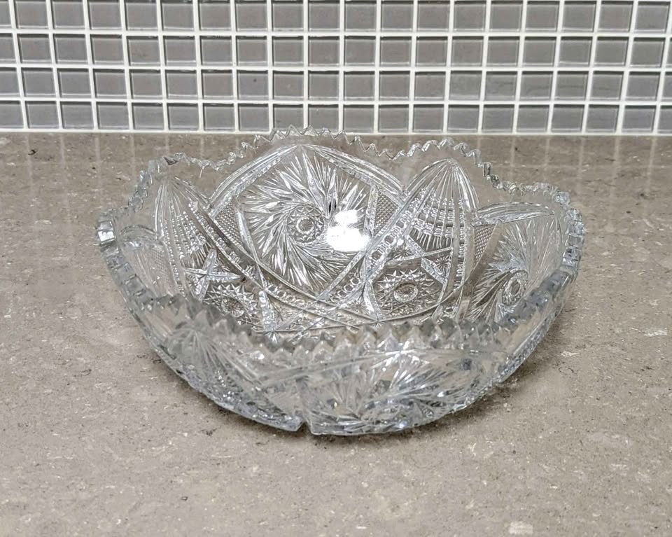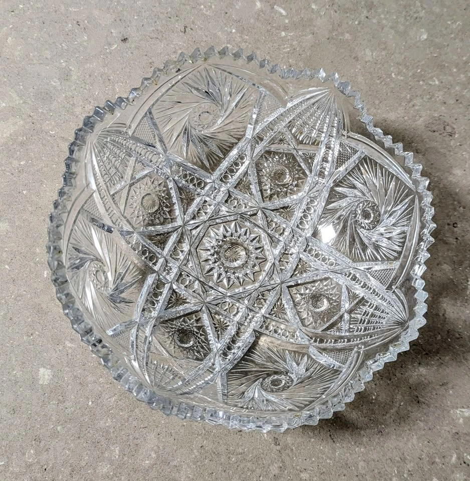 Stunning piece of antique American Brilliant Period (ABP) cut glass, likely dating from the turn of the 20th century. This heavy crystal bowl features intricate, deep cuts with a rich geometric pattern.