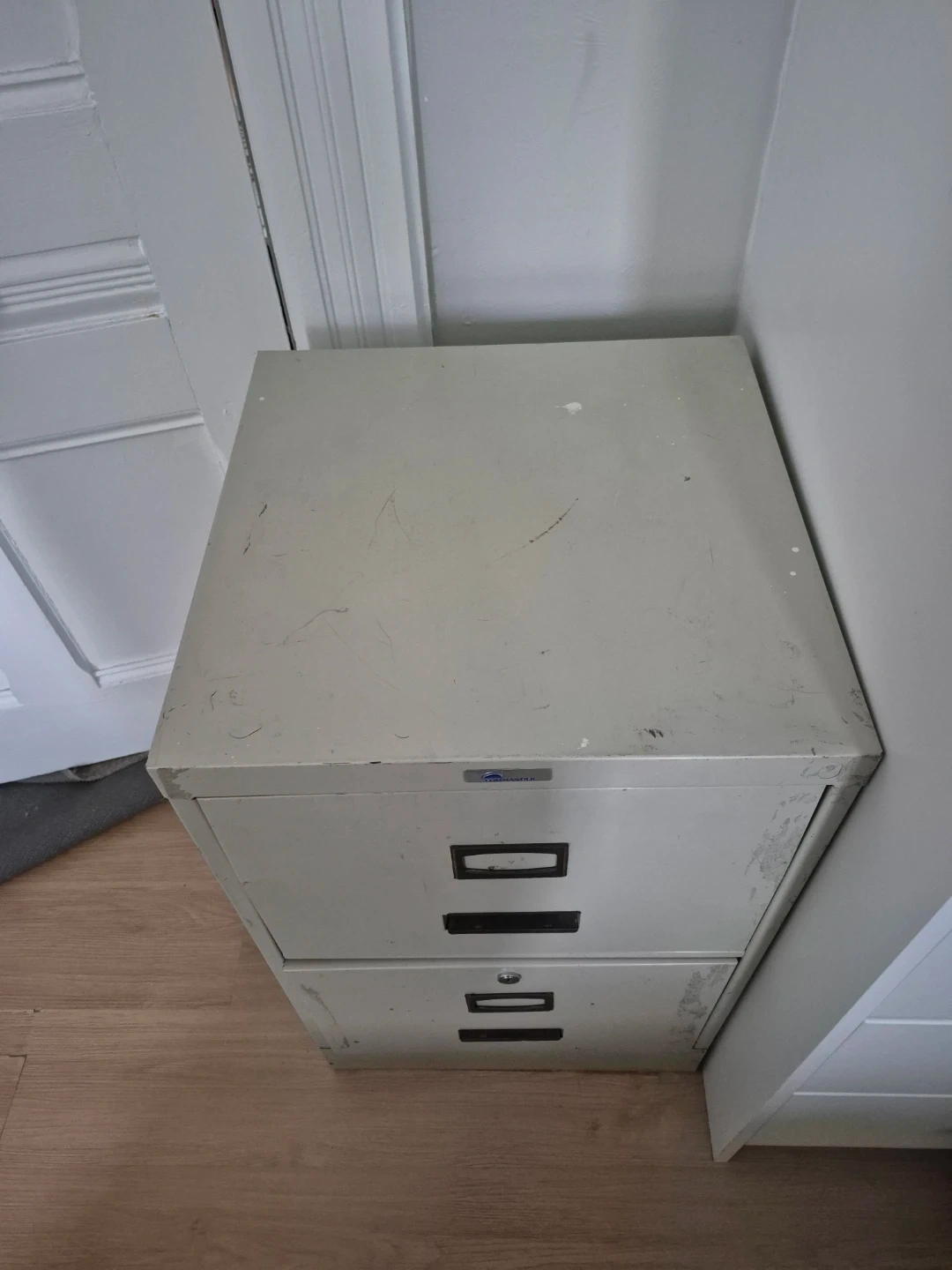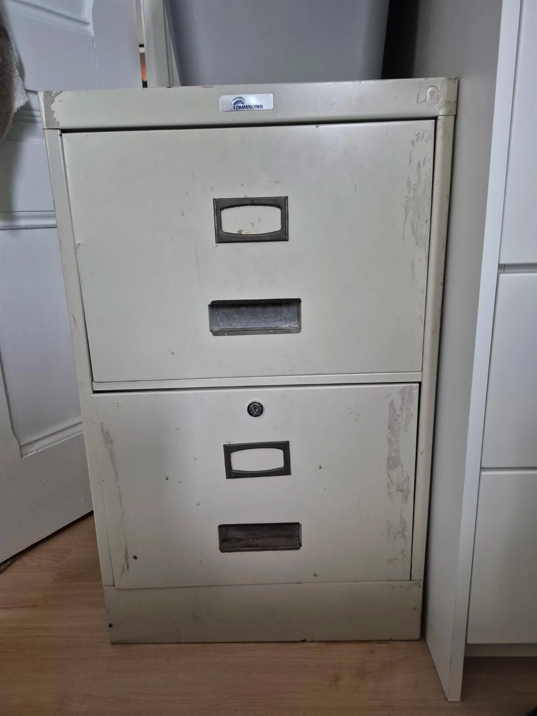 Selling a two-drawer filing cabinet by Commander. It's a sturdy piece of furniture, perfect for organizing your documents and keeping your workspace tidy. It does have some signs of wear but is still fully functional and ready to use! Sorry no key included.