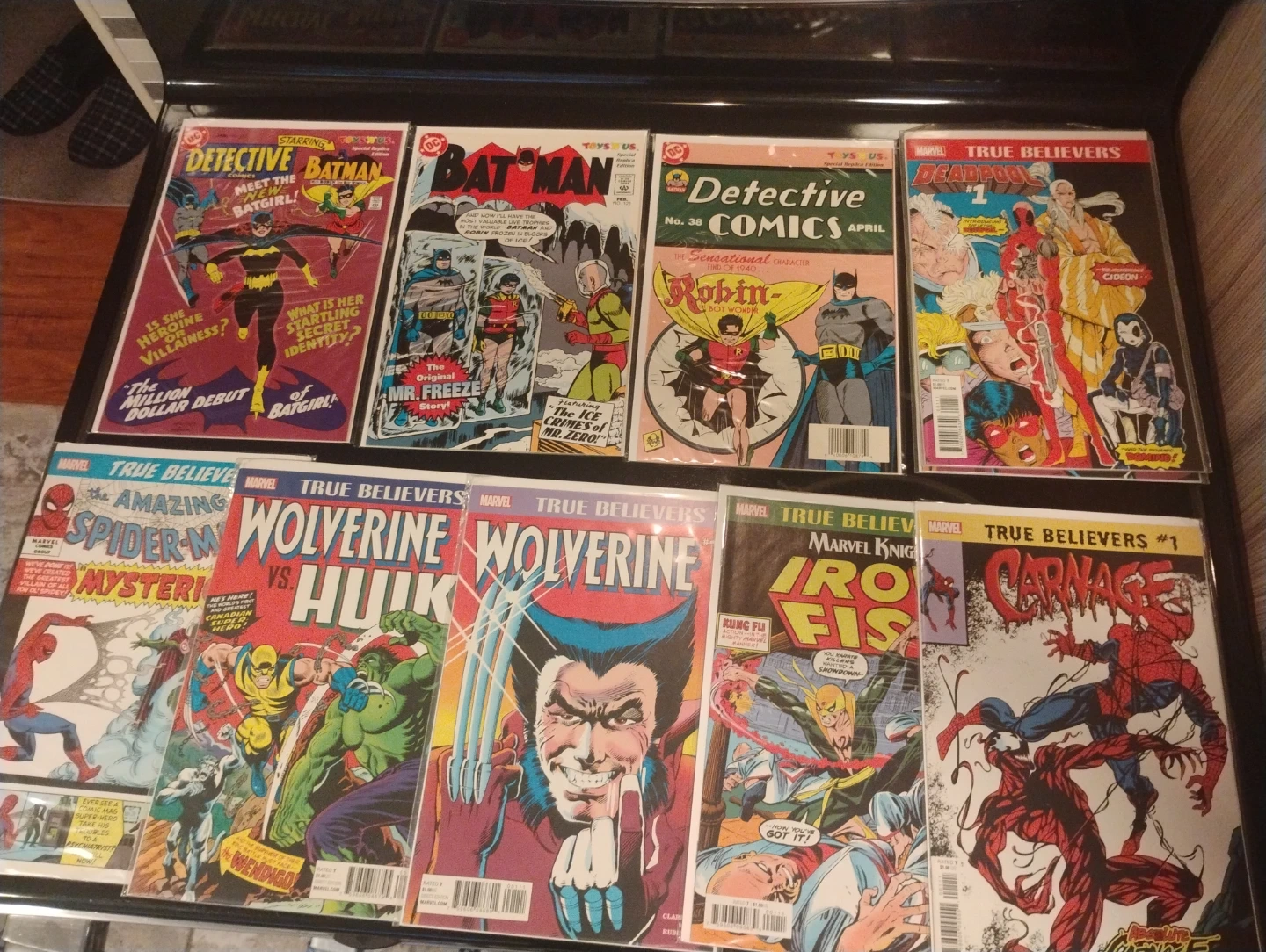Selling a collection of Marvel and DC comic books, including Toys r Us reprint Detective Comics, Deadpool, Wolverine, Iron Fist, Carnage, and more! Great for collectors or anyone looking to start reading comics