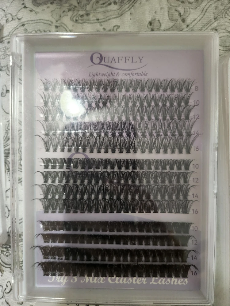 Selling a set of Quaffly Try 5 Mix Cluster Lashes. These lashes are designed to be lightweight and comfortable, making them perfect for everyday wear or special occasions. They come in a variety of lengths, including 8mm, 10mm, 12mm, 14mm, and 16mm.