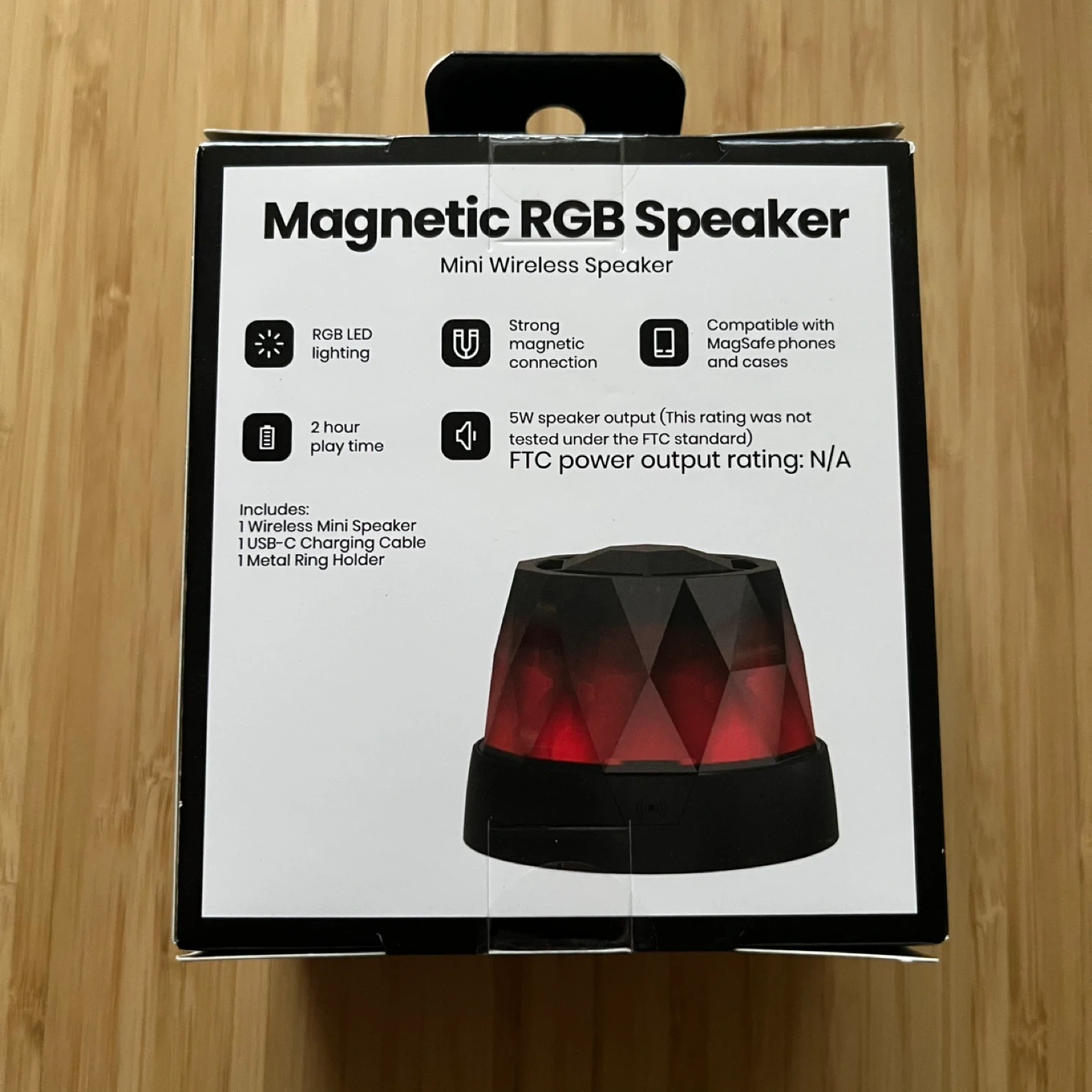 Brand new Magnetic RGB Mini Wireless Speaker, still in its original box! It features RGB LED lighting and a strong magnetic connection, making it compatible with MagSafe phones and cases. Enjoy up to 2 hours of playtime and vibrant, portable sound. Included is the wireless mini speaker, a USB-C charging cable, and a metal ring holder.