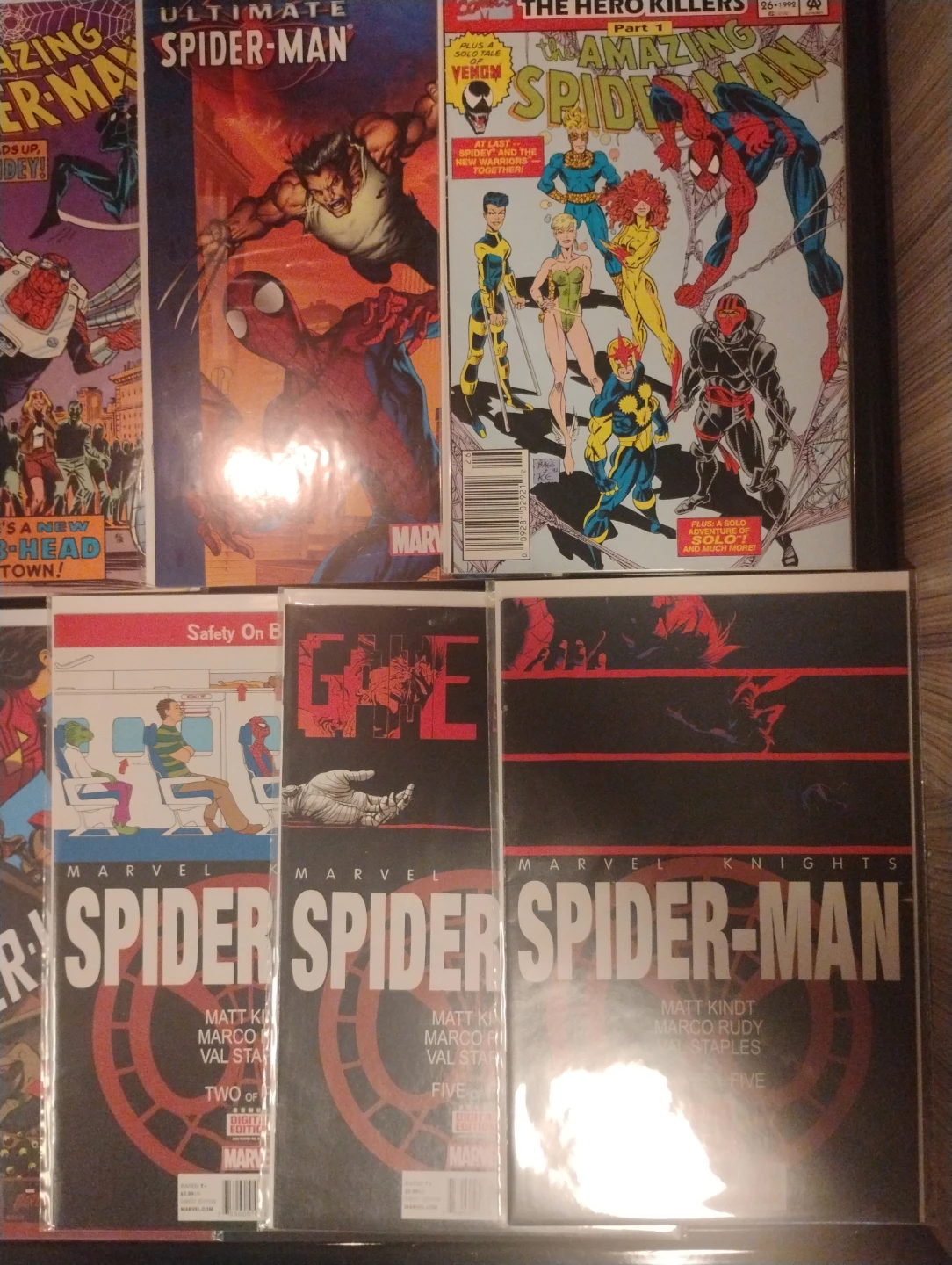 Selling a collection of Spider-Man comic books! Includes various titles such as The Amazing Spider-Man, Ultimate Spider-Man, and Marvel Knights Spider-Man. Great for any collector or Spider-Man fan!