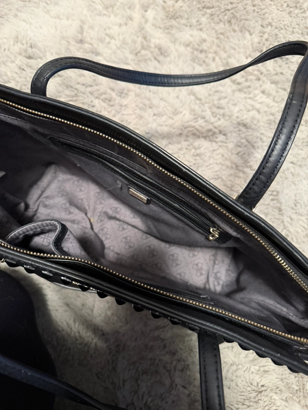 Selling a stylish Guess tote bag in black and white! It's in great shape and perfect for everyday use. The bag features a spacious interior and sturdy handles.
