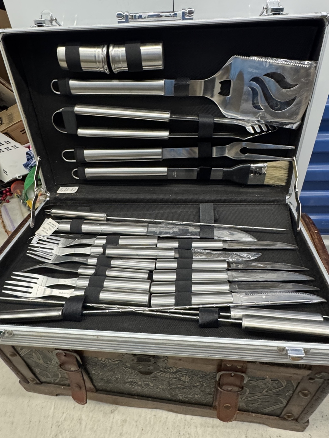 Selling a complete BBQ grill tool set, perfect for summer grilling! The set comes in a sturdy case to keep everything organized. Includes a variety of tools to handle all your grilling needs. Great for backyard barbecues or camping trips!