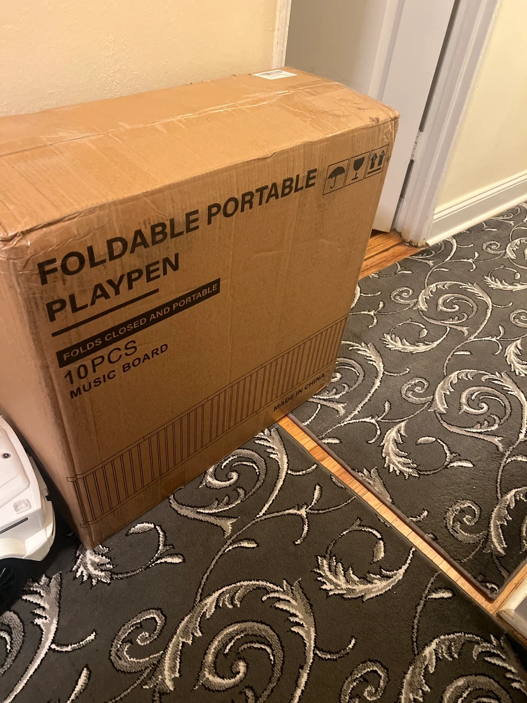 Selling a foldable portable playpen that's perfect for infants and toddlers! It's an adjustable multi-shape wooden play yard with a baby fence play area. The playpen measures 57x85x24 inches. It's collapsible and portable, making it easy to store and transport. Comes in the original box!