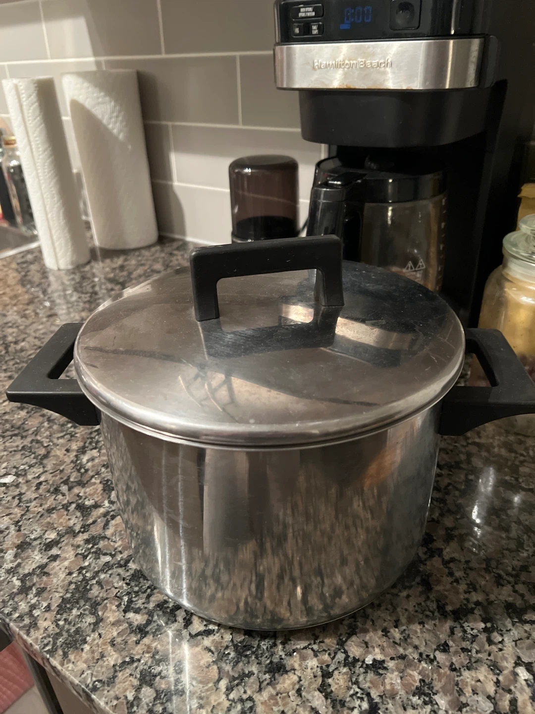 Stainless steel stock pot with a lid. It's in good condition and ready for your next cooking adventure!