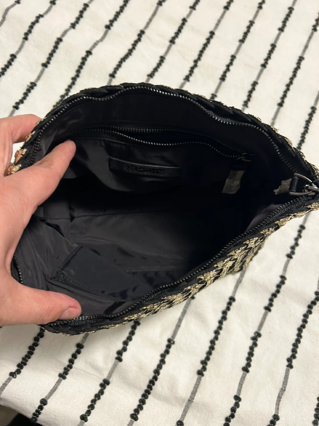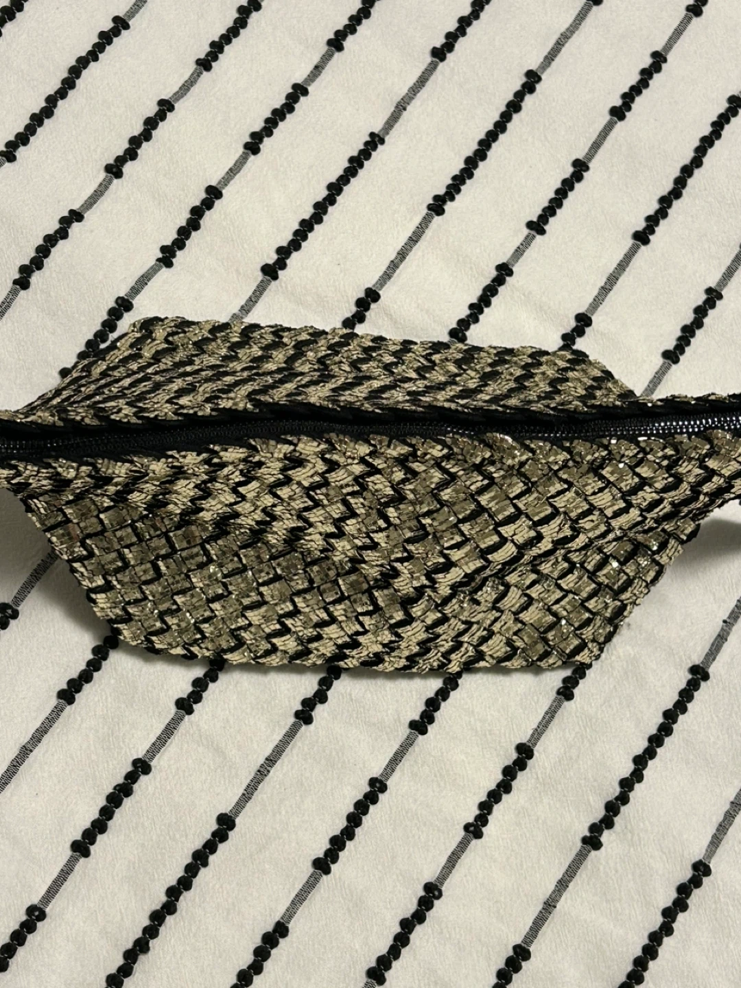 Selling a cute Naghedi gold woven clutch! It's in great condition and perfect for a night out. The inside is lined with black fabric and has a zipper pocket length 29 cm. x 16cm high. open to reasonable offers. I invite you to view my other items; if you are interested in any of them, I will give you a better price.