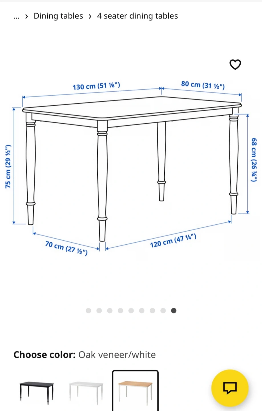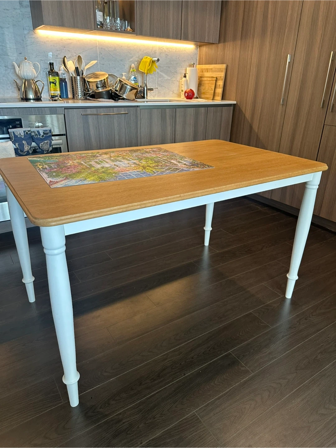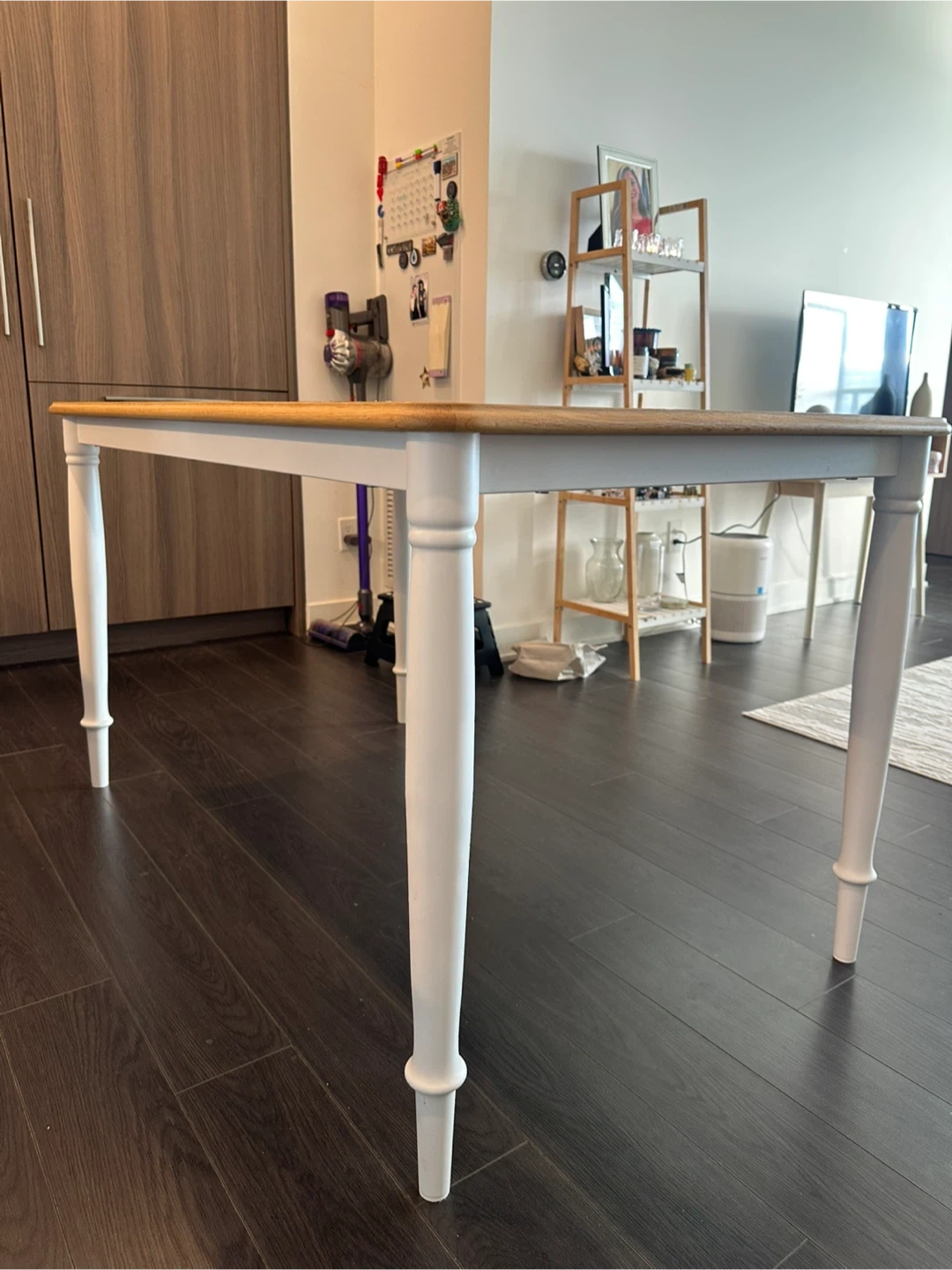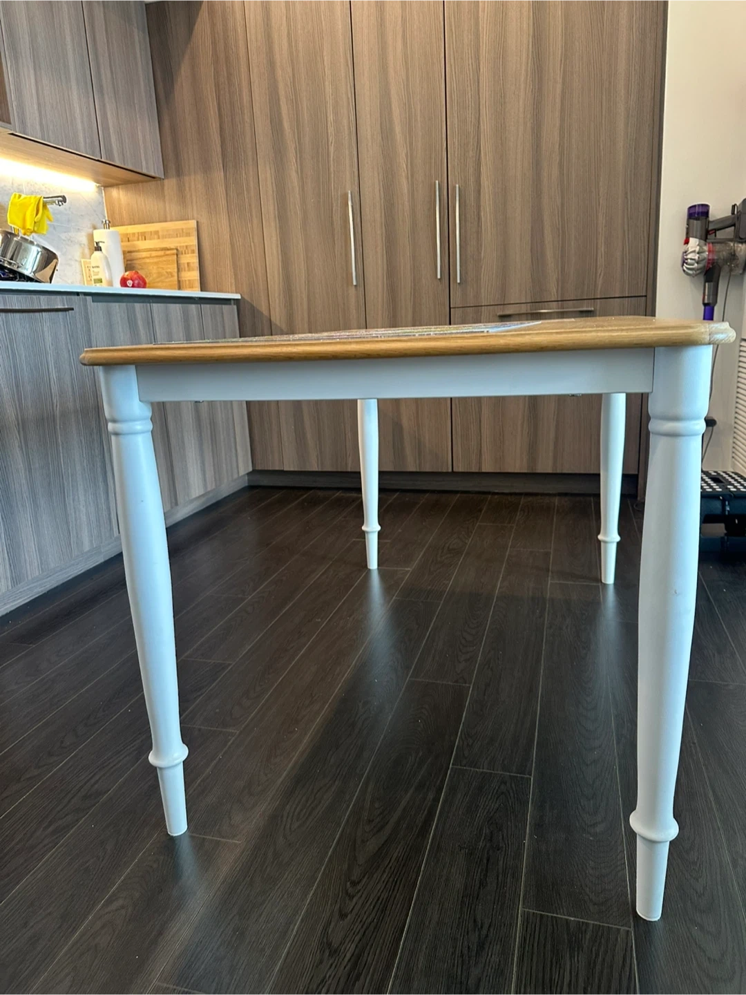 Selling a dining table with an oak veneer top and white legs. The dimensions are approximately 130 cm (51 1/8") x 80 cm (31 1/2") x 75 cm (29 1/2")