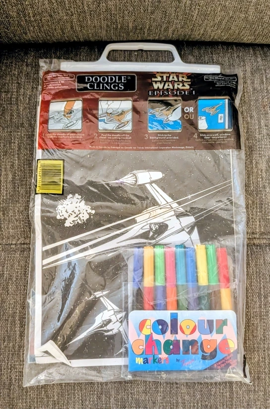 Selling a Star Wars Episode I Doodle Clings set! Colour the doodle of your choice with the markers provided, peel the doodle off the sheet, and stick to the background provided or on a wall or window