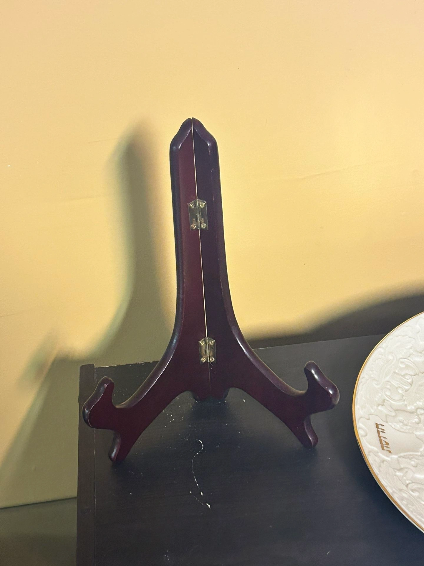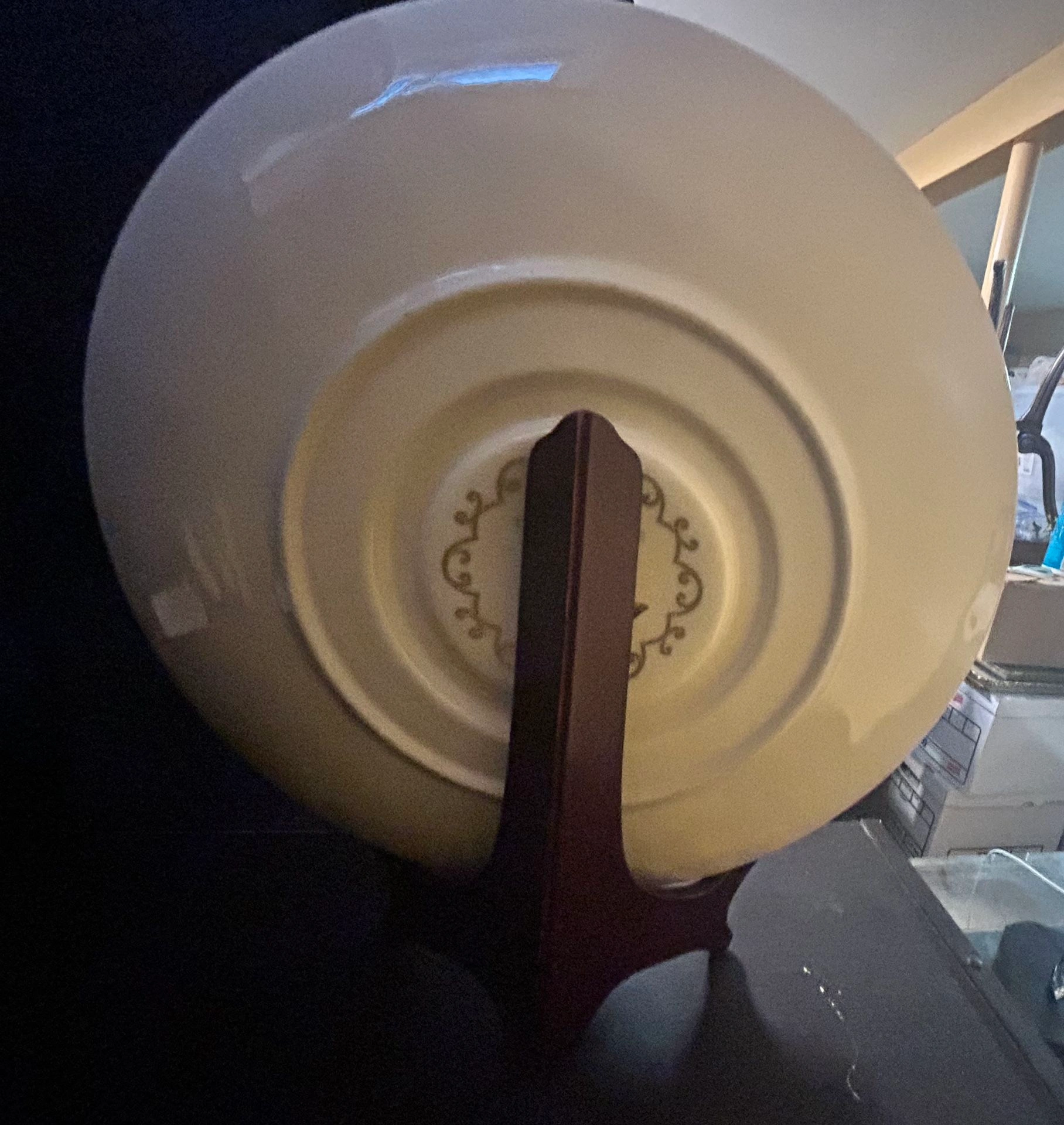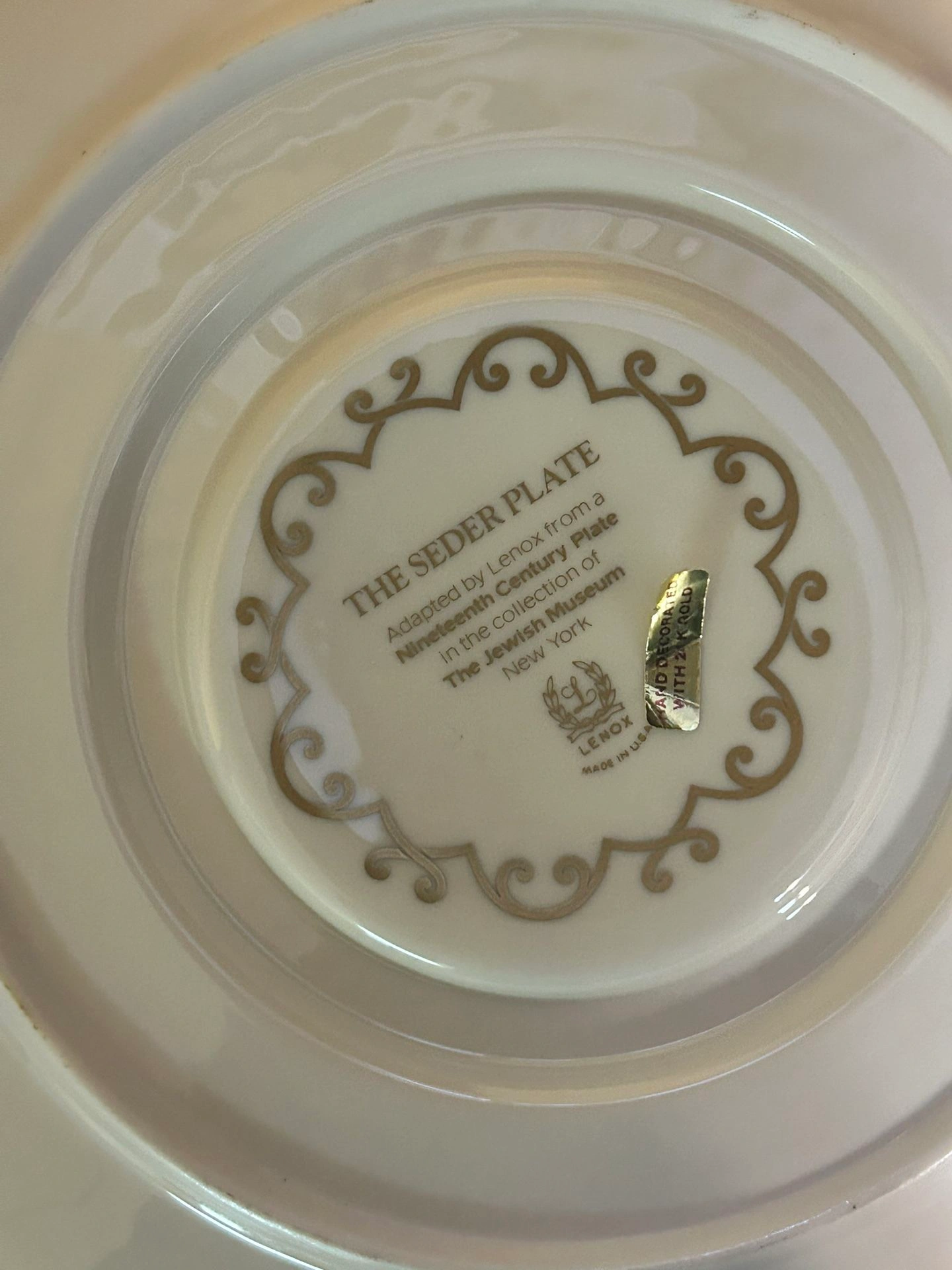 Cream-colored porcelain Seder plate. Features embossed floral design and Hebrew lettering. Gold detailing. Includes wooden stand. Perfect for Passover!