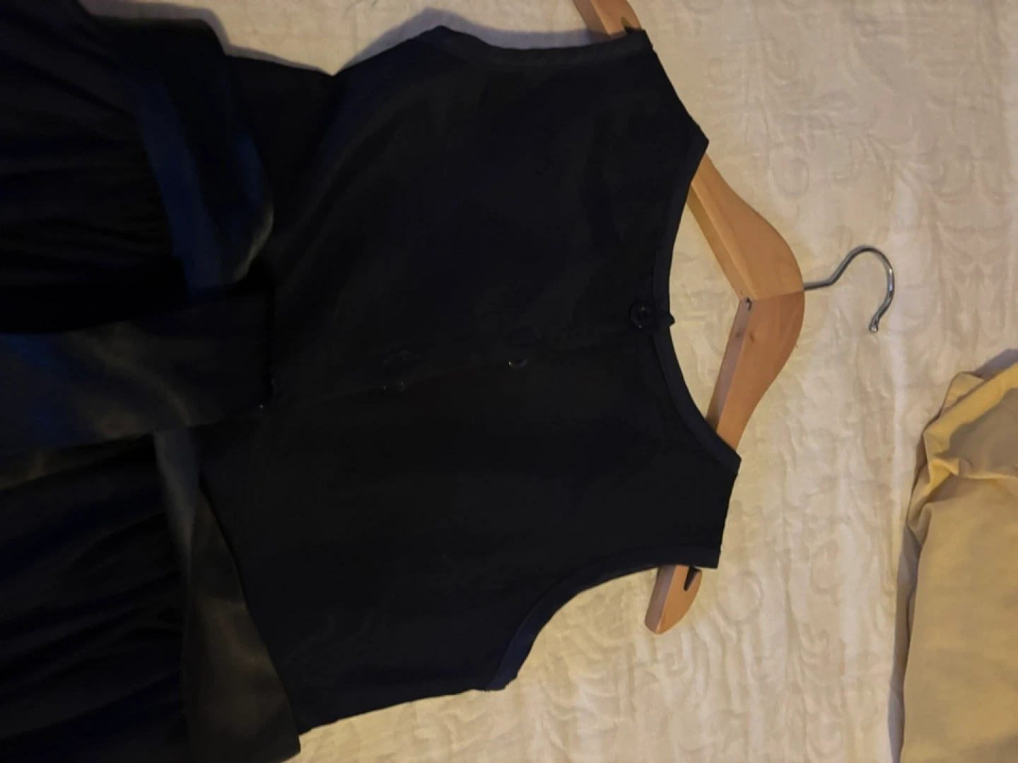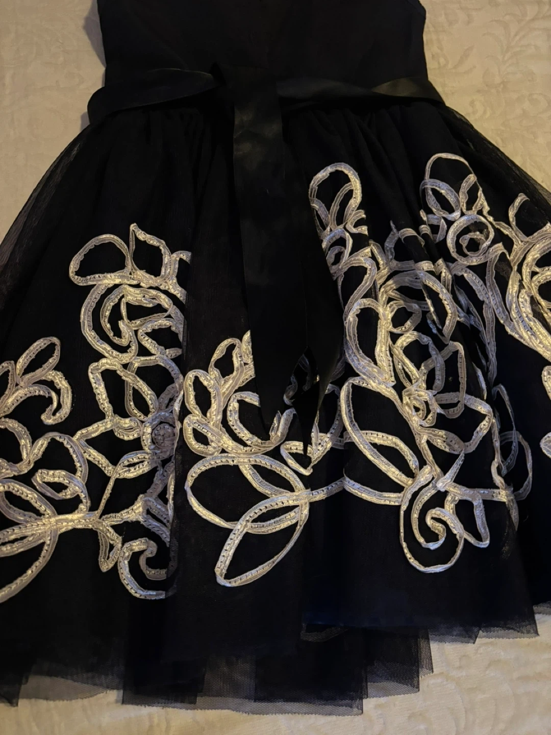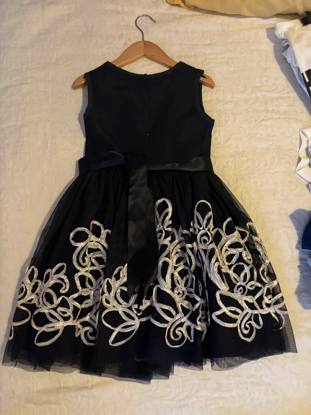 A lovely navy blue dress for girls, featuring a beautiful floral design on the skirt and a cute flower detail at the waist. It's in great condition and ready for a special occasion! Side 7