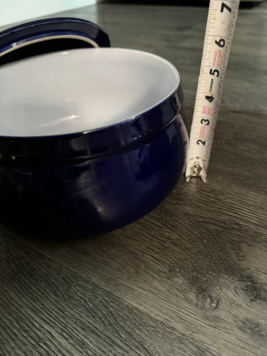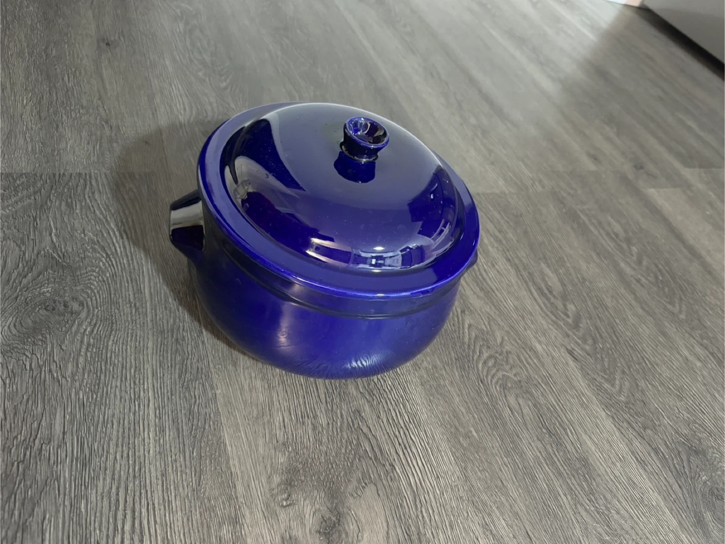 A charming blue ceramic pot with a lid. It's perfect for serving or small batch cooking. Measures approximately 7 inches tall with the lid on.