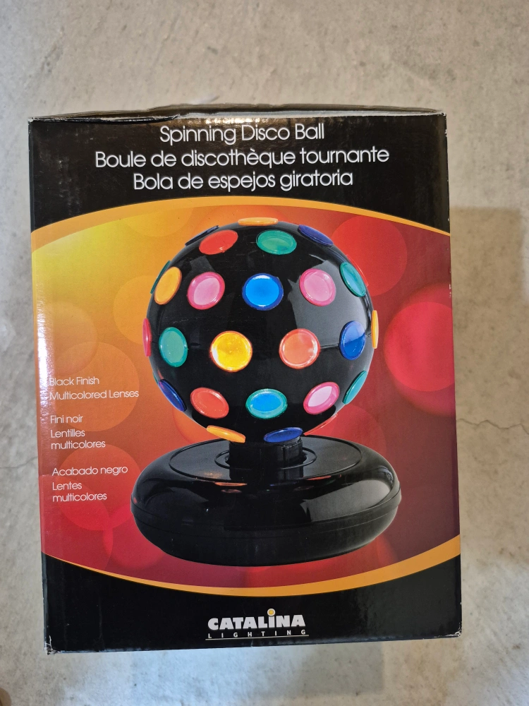 Get the party started with this fun spinning disco ball from Catalina Lighting! It has a black finish and multicolored lenses, perfect for adding some sparkle to any room. It comes with the original box