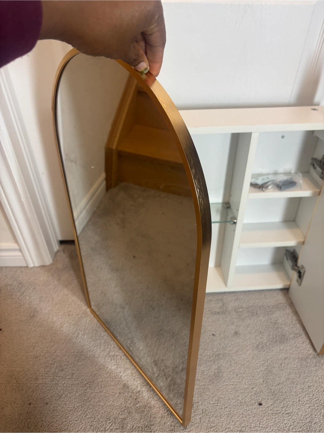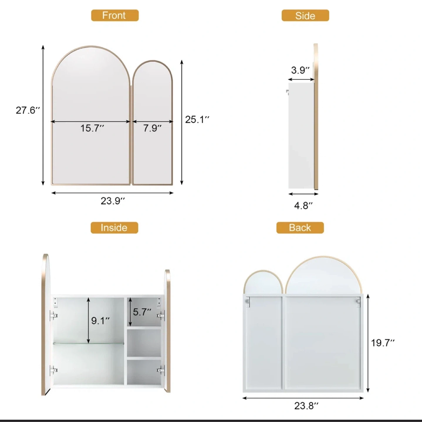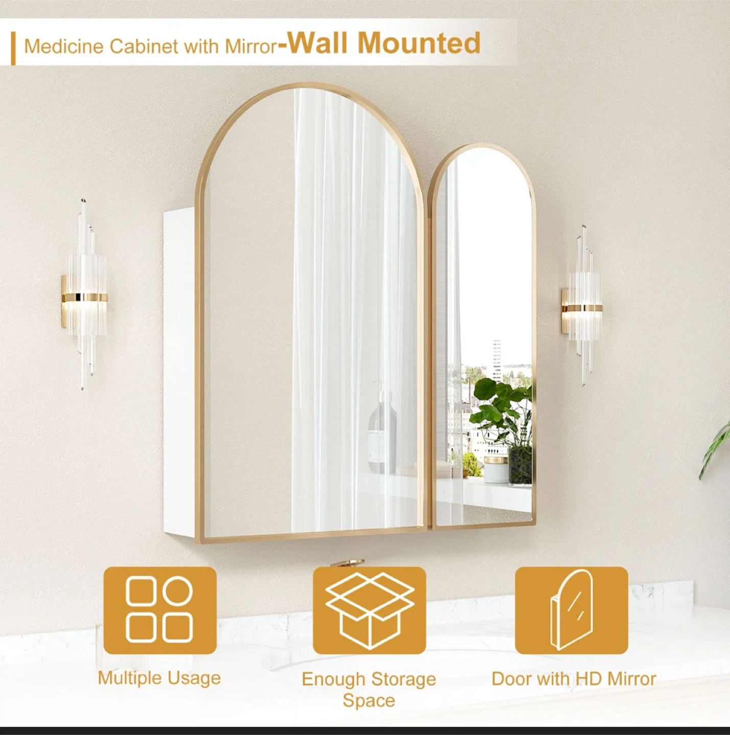 Selling an Ebern Designs arched medicine cabinet with a brushed brass finish! This stylish cabinet features a unique arched design and offers ample storage for your bathroom essentials.