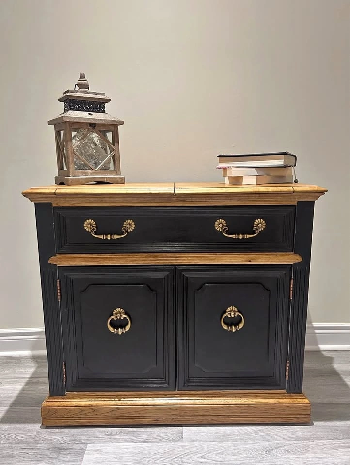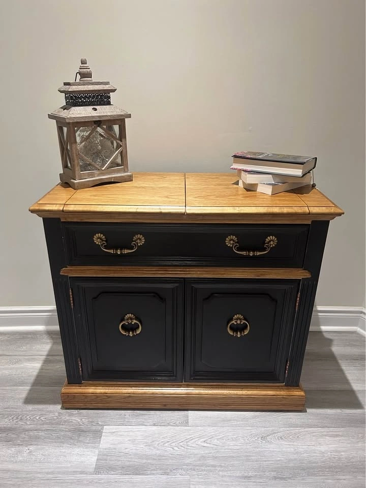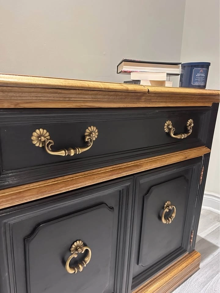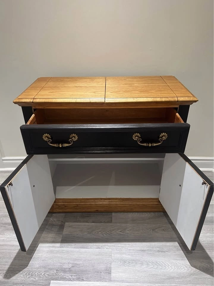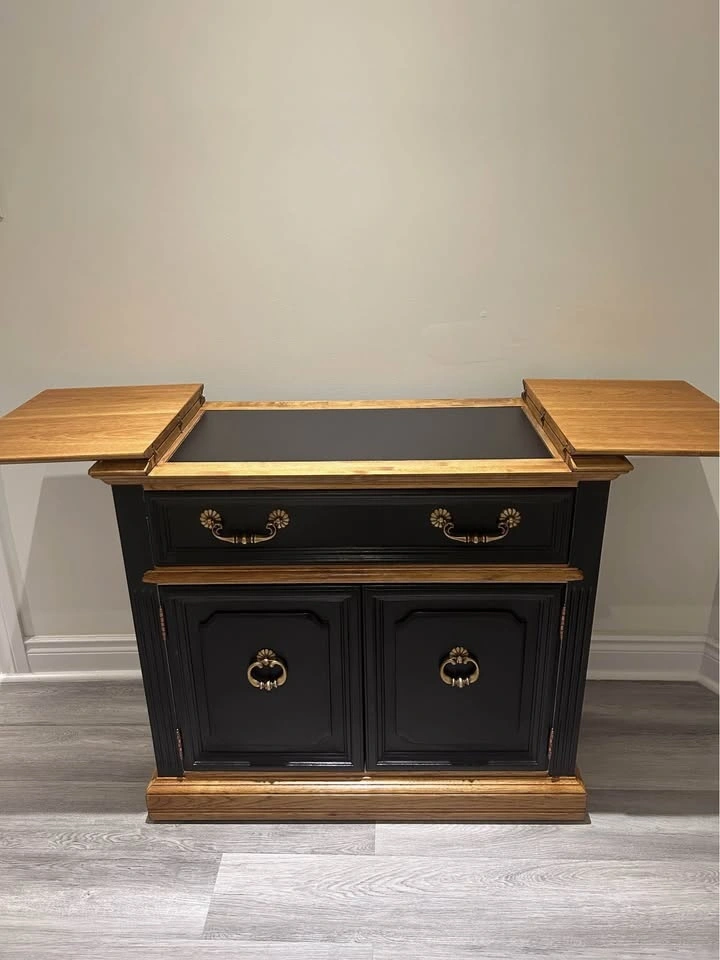 Refinished sideboard server in black limousine leather. Features original hardware and rolling wheels.