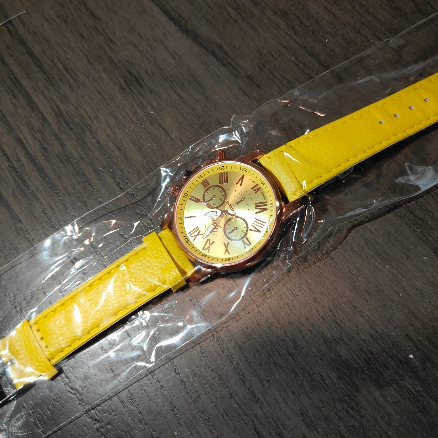 Selling a stylish yellow fashion watch! It's brand new and still in its original packaging. The watch features a classic design with Roman numerals and a bright yellow strap. Perfect for adding a pop of colour to your outfit!