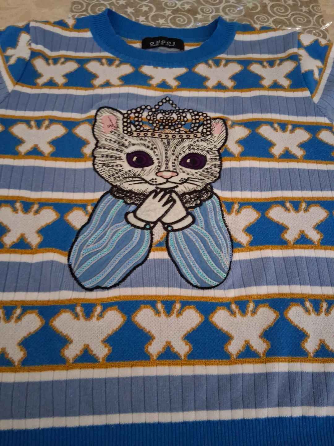 BOXING DAY. Inspired G knit sweater.! Lovely sequin Kitty and her crown.. Blue with white and gold accents, made in Italy. A staple in any wardrobe for any season!