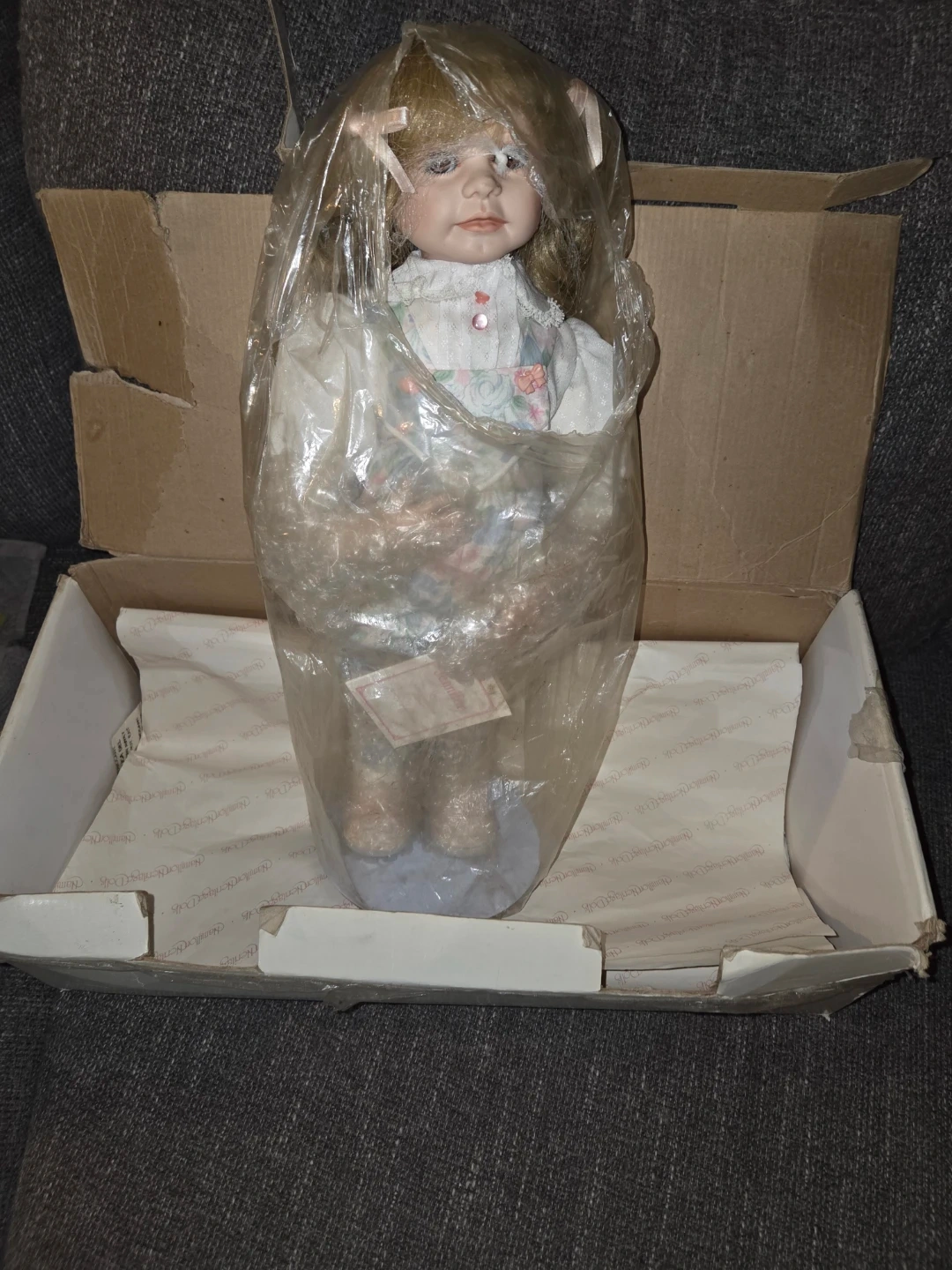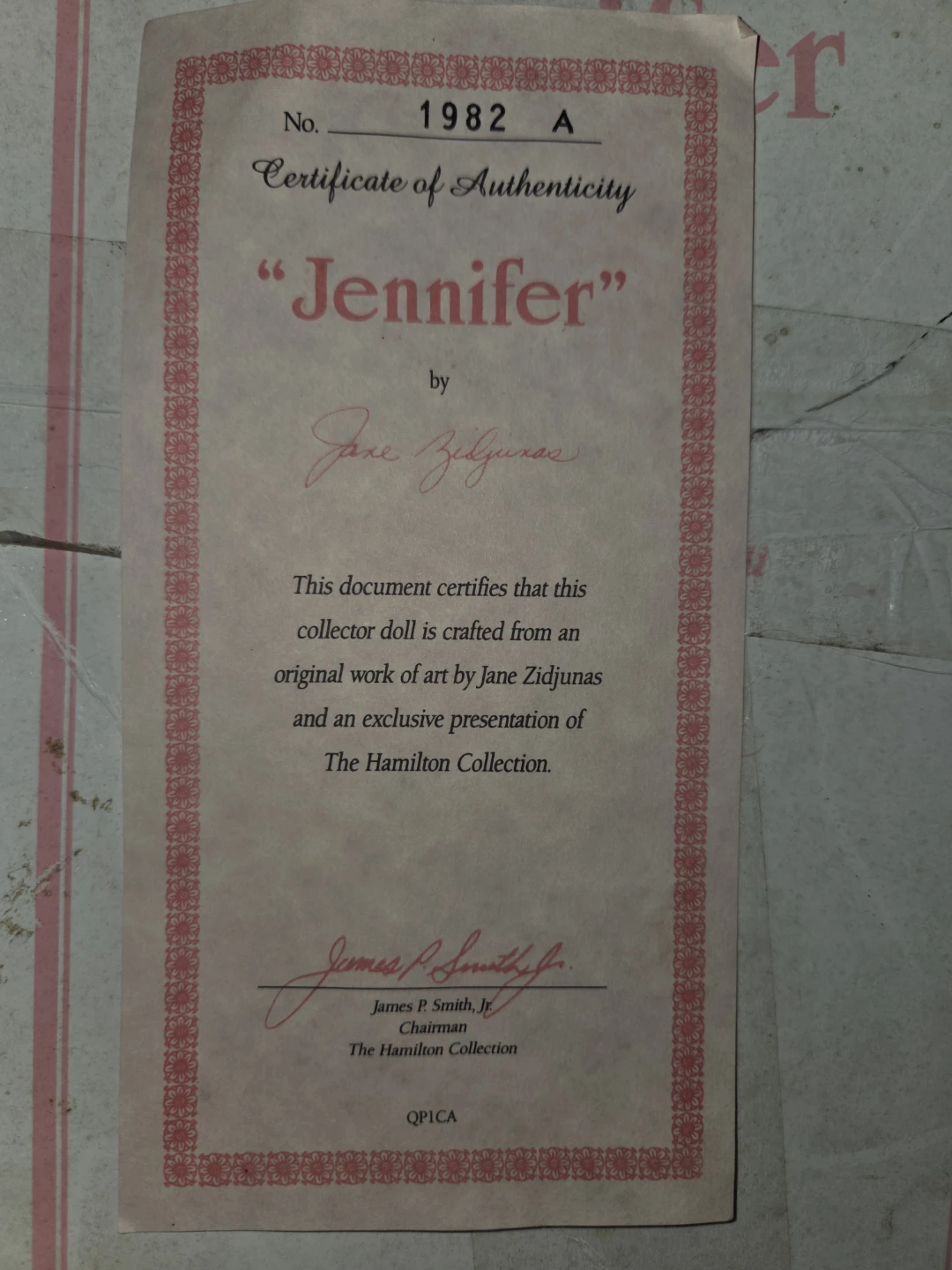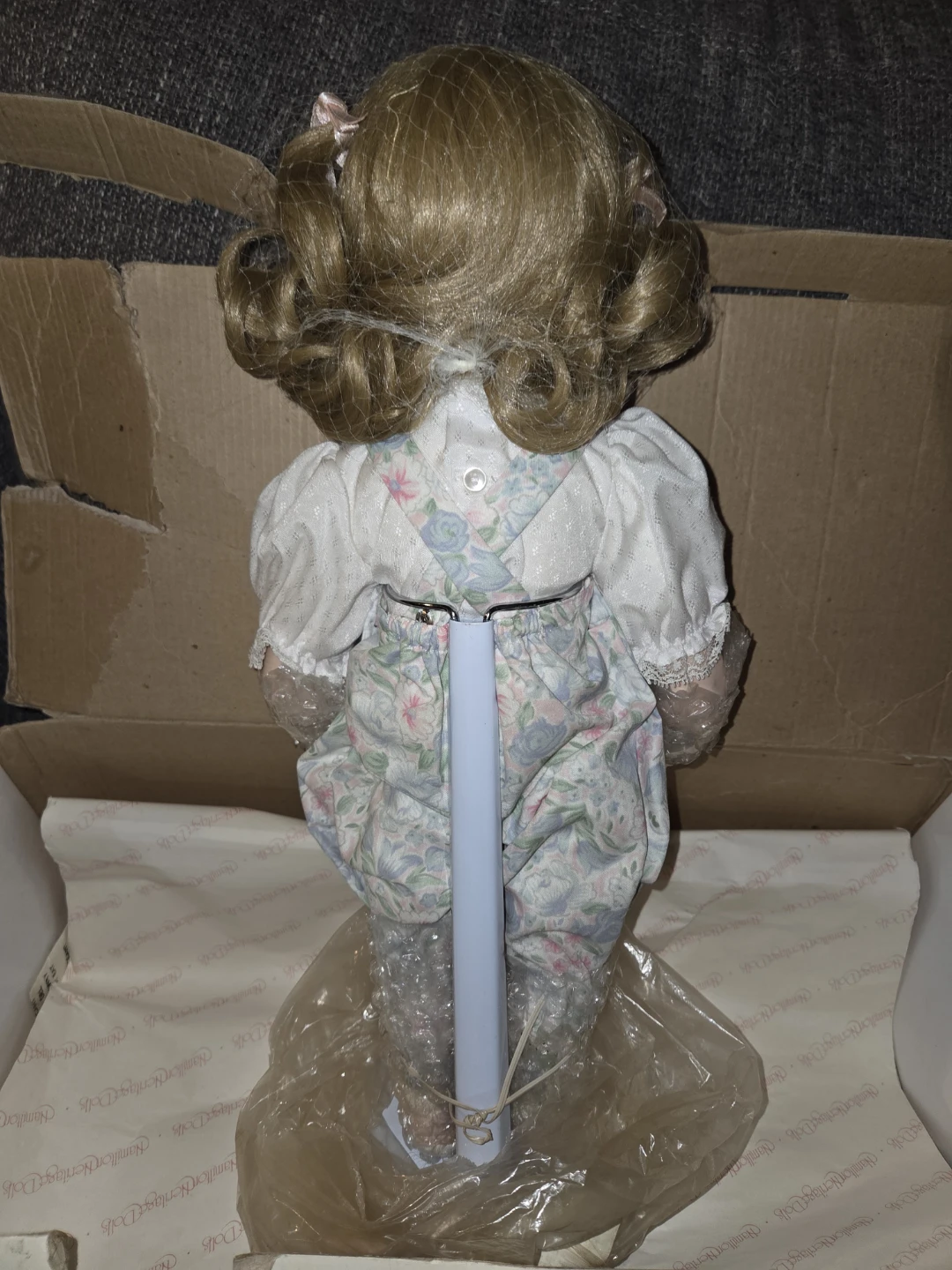 Selling a Jennifer doll from The Hamilton Collection. This doll was created by Jane Zidjunas and is crafted in fine bisque porcelain, delicately painted by hand, and dressed in hand-tailored clothing. Comes in its original box! The box is a little messed up, but it is new still in the wrapper as well.