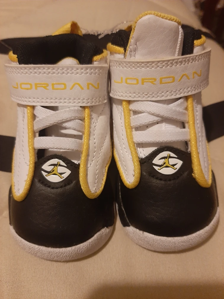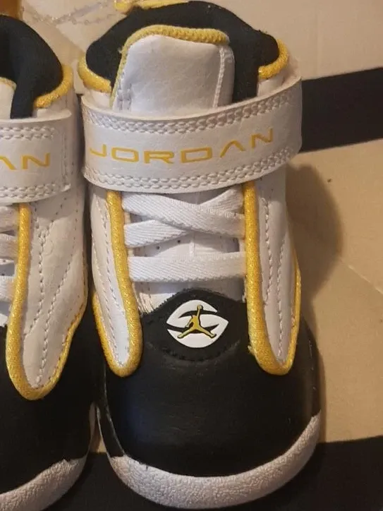 These adorable Jordan baby shoes are in great condition! They feature a classic black and white design with vibrant yellow accents. Perfect for your little one's first steps or as a stylish addition to their wardrobe