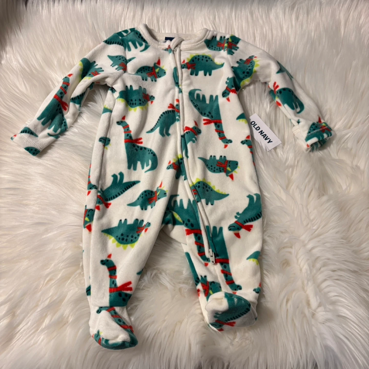 This Old Navy sleepsuit is brand new with tags! It features a cute dinosaur print and is sized for 0-3 months. The original price was $19.99. Perfect for keeping your little one cozy!