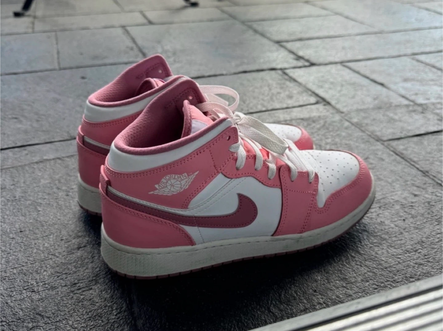 Selling a pair of Nike Air Jordan 1 Mid sneakers in pink and white! They are a size 6.5Y. These stylish sneakers are in great condition and ready for a new owner!