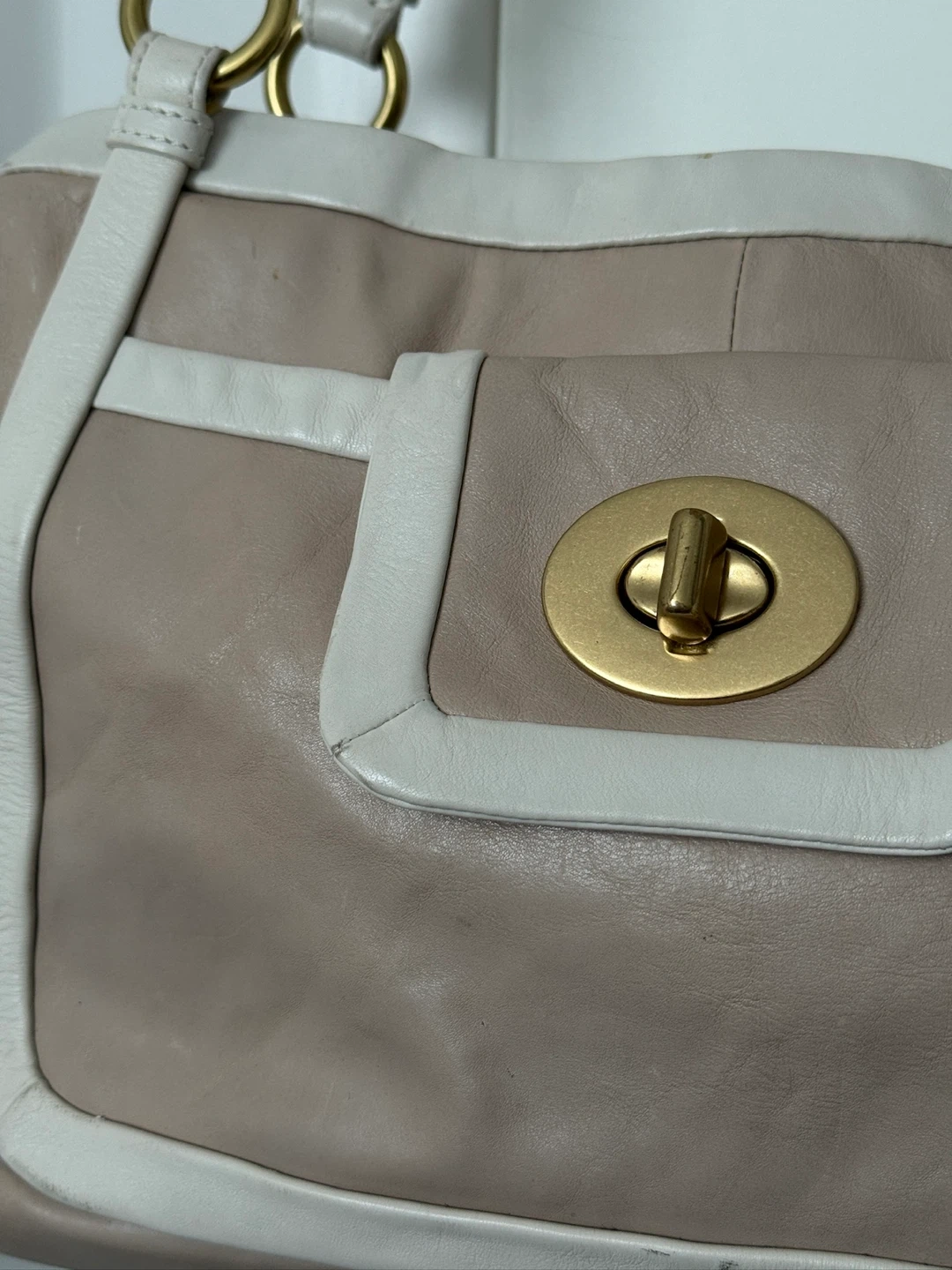 Selling a Coach leather shoulder bag in a lovely neutral colour with a light purple interior. It's a stylish and functional bag, perfect for everyday use. The bag has a turn-lock closure and is in good condition.