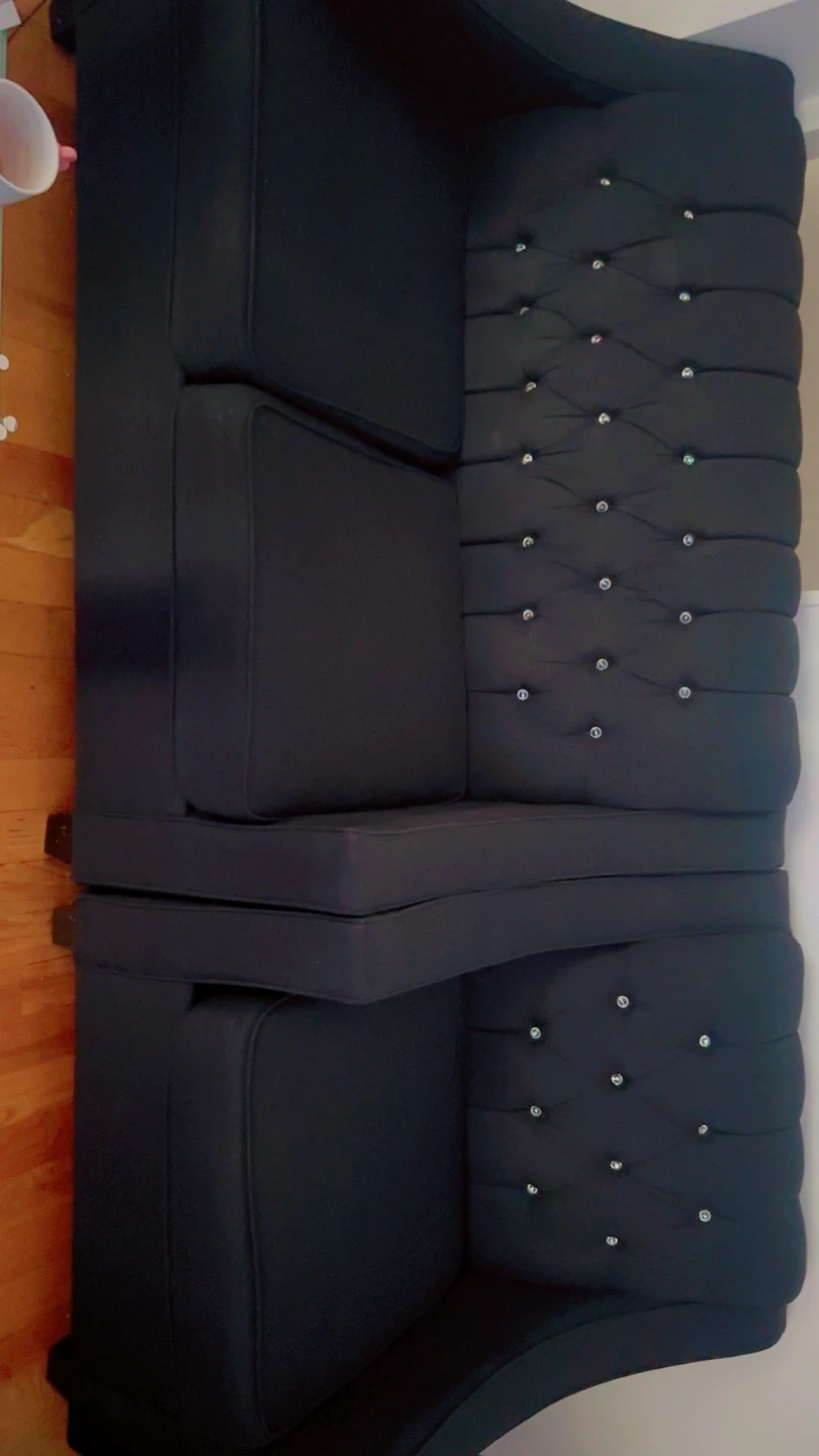 Selling a black sofa couch. It features a tufted design with button accents, giving it a stylish and elegant look. The cushions appear to be in good condition, offering comfortable seating. Perfect for adding a touch of sophistication to your living space