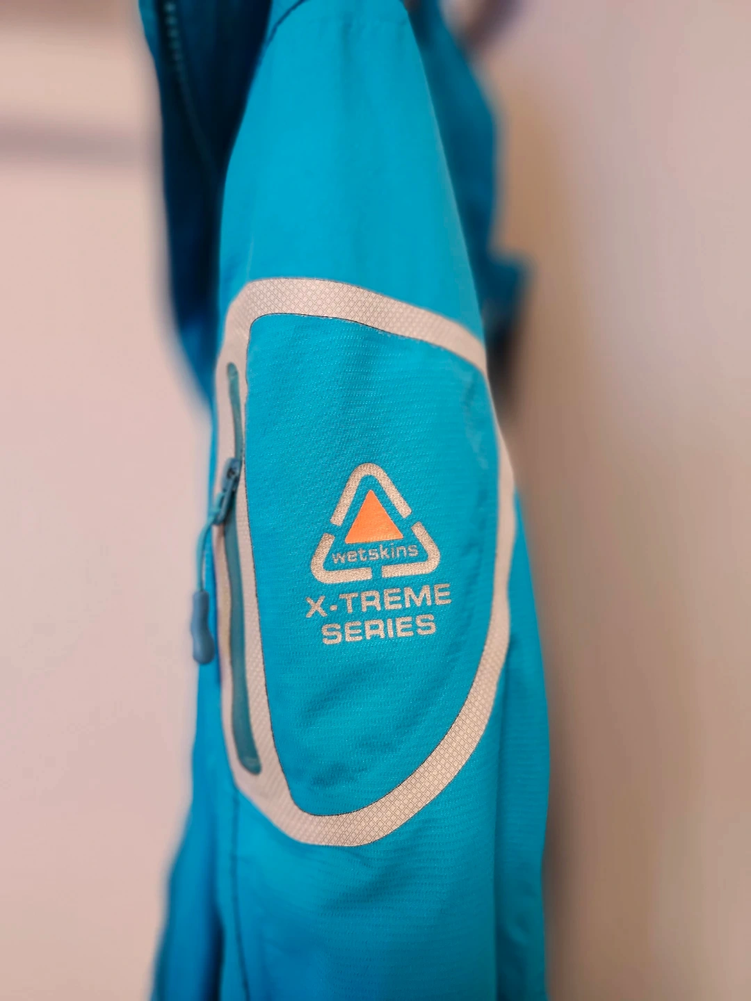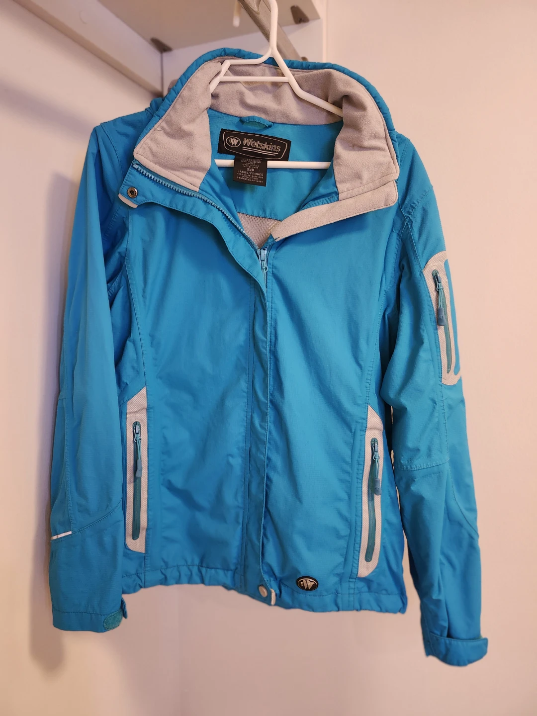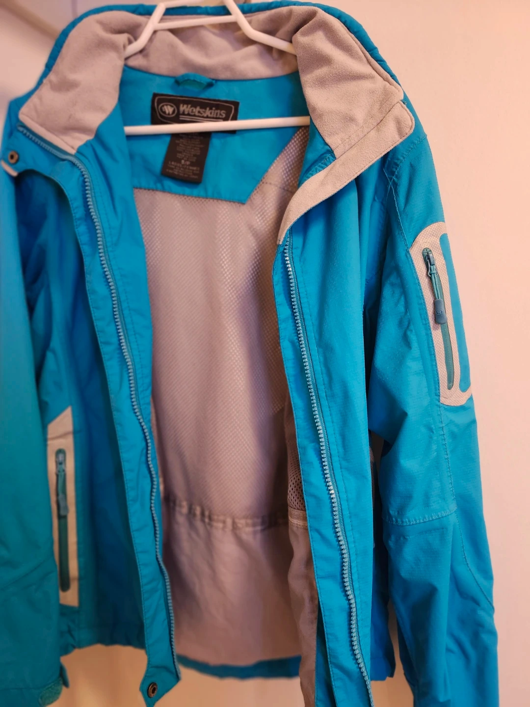 Wetskins X-Treme Series jacket in a teal blue colour. Women's Small. The jacket features a detachable hood and several zippered pockets, reflective tape, covered front zipper, elasticized cuffs with velcro, mesh lining. It's wind and water resistant perfect for outdoor activities! From a NS, NP home and freshly laundered.