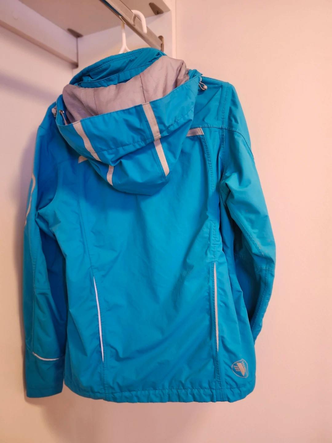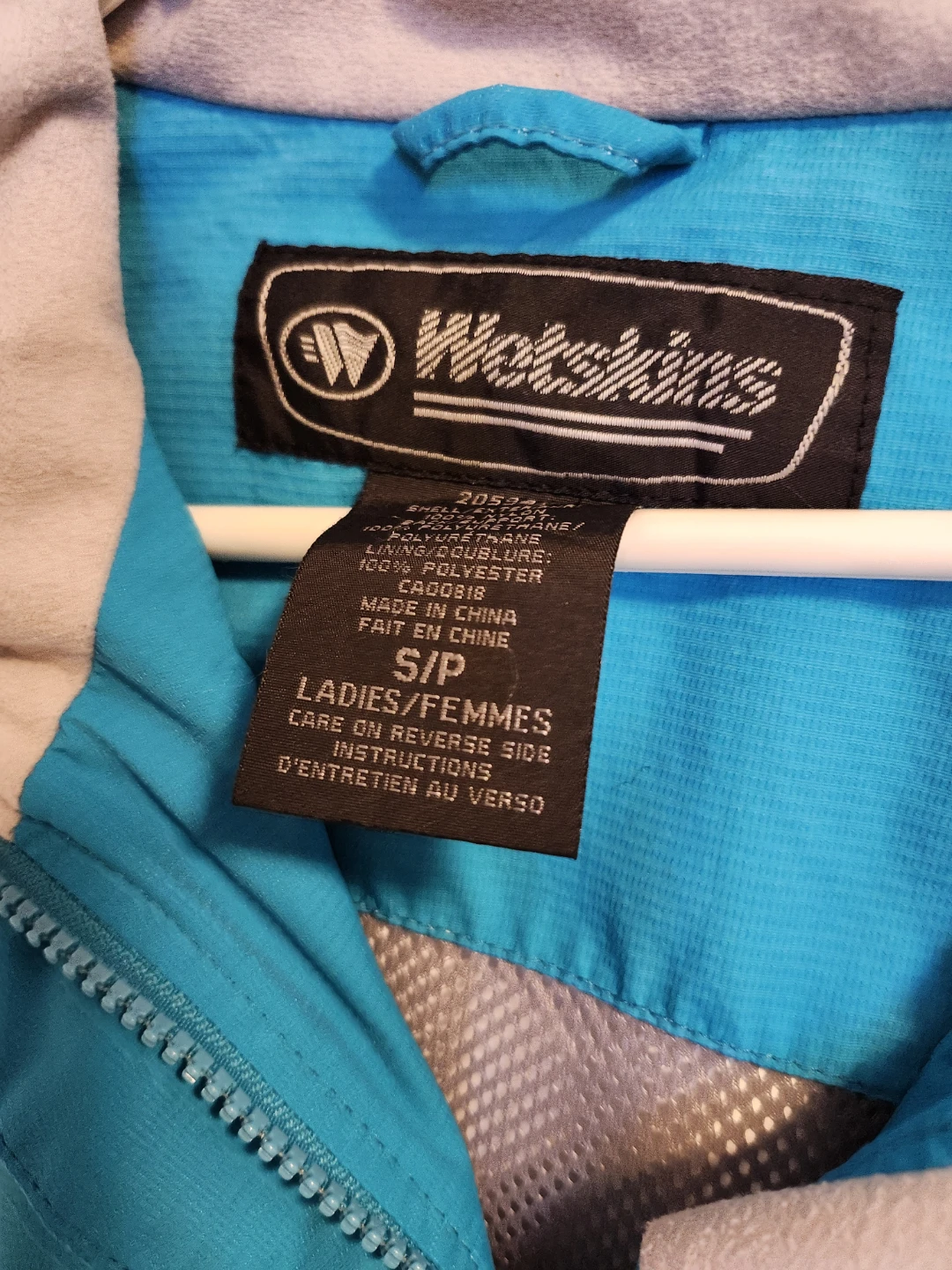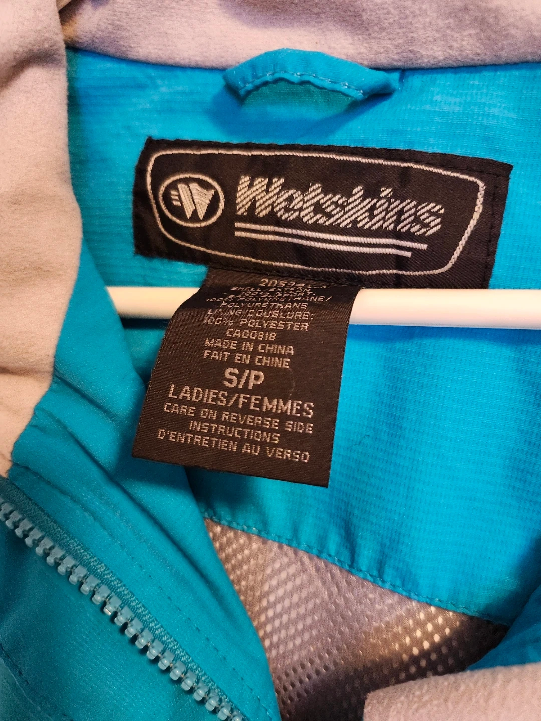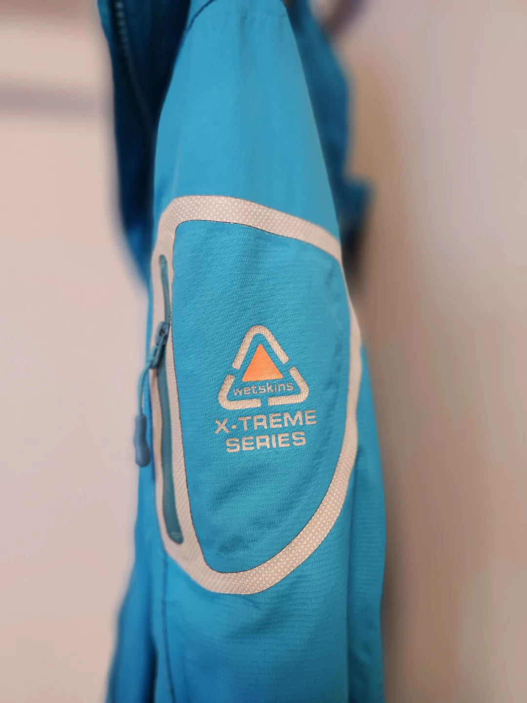 Wetskins X-Treme Series jacket in a teal blue colour. Women's Small. The jacket features a detachable hood and several zippered pockets, reflective tape, covered front zipper, elasticized cuffs with velcro, mesh lining. It's wind and water resistant perfect for outdoor activities! From a NS, NP home and freshly laundered.
