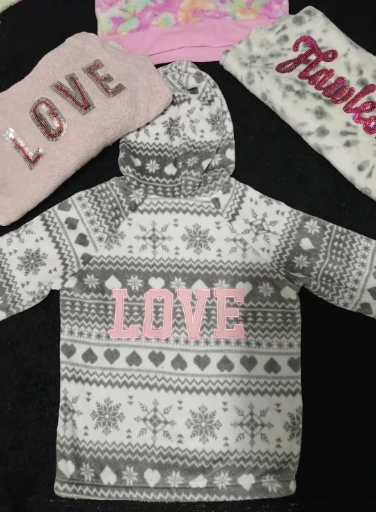 Selling a cozy hooded sweaters with a cute pattern and the word 'LOVE' on the front, Also included is a colourful sweater with a panda design, a grey one with the word ' LOVE ' on the back and gray one with the word 'FLAWLESS' . They are all super soft , Perfect for keeping your little one warm and stylish!