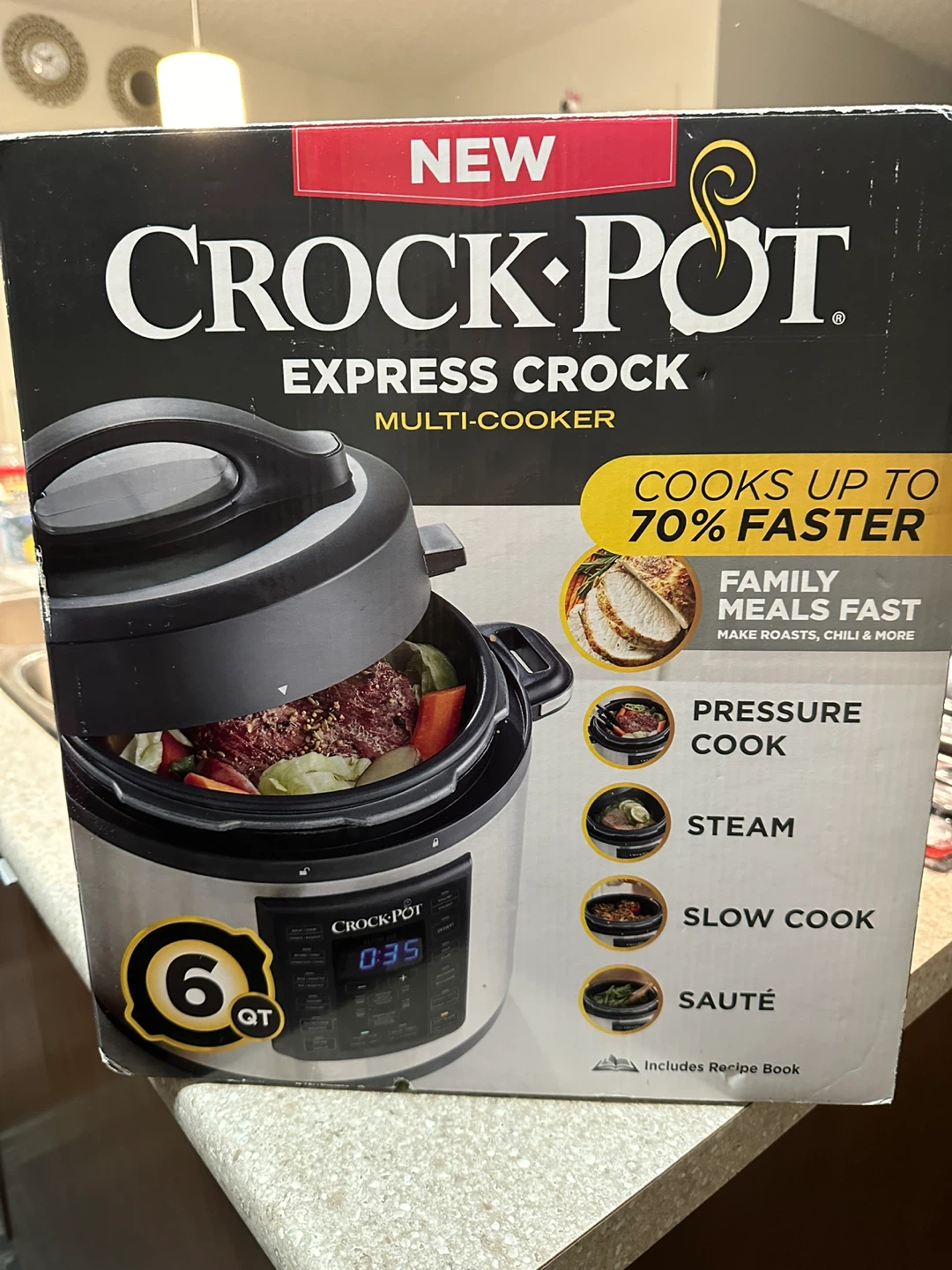 Selling a brand new Crock-Pot Express Crock Multi-Cooker! This 6-quart multi-cooker is perfect for pressure cooking, steaming, slow cooking, and sautéing. Cooks up to 70% faster and includes a recipe book. Get yours today!