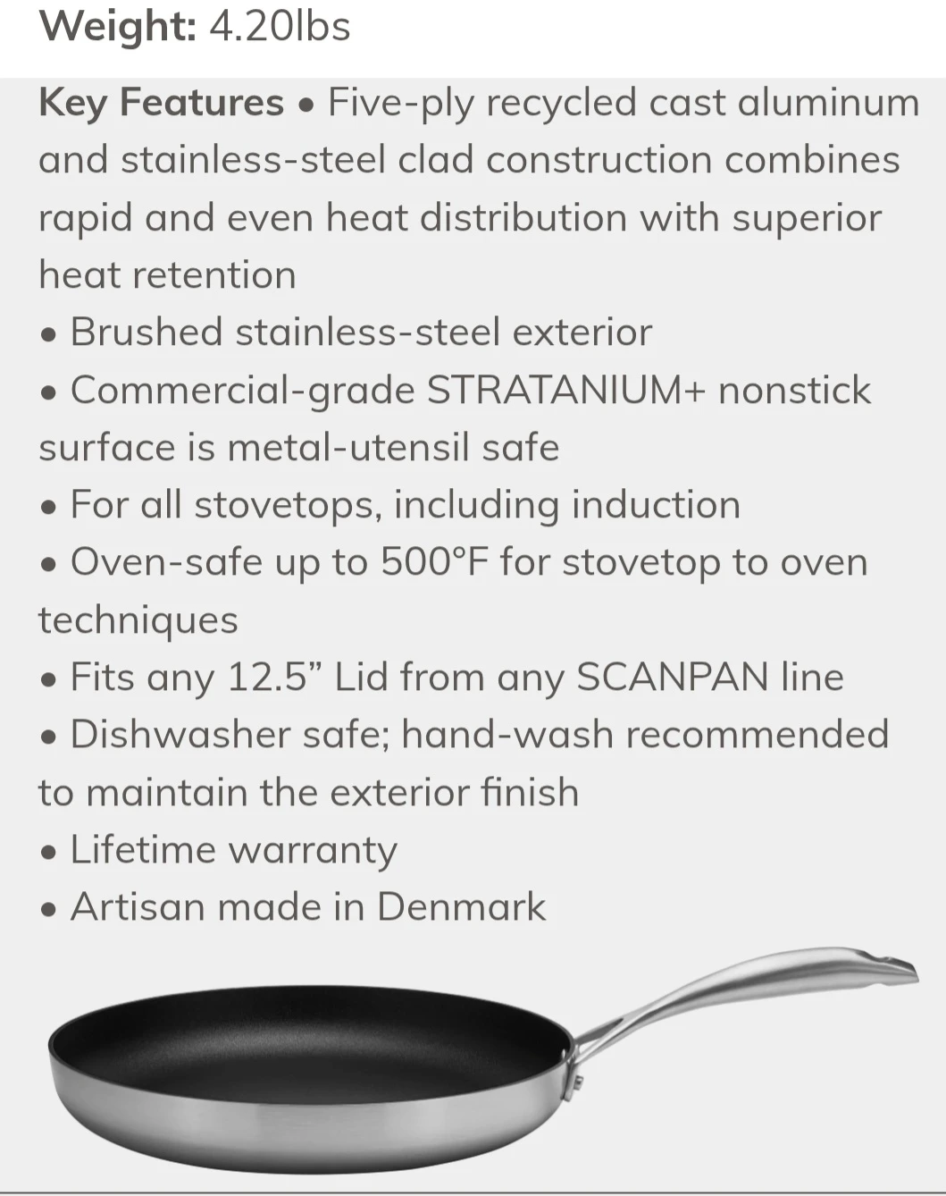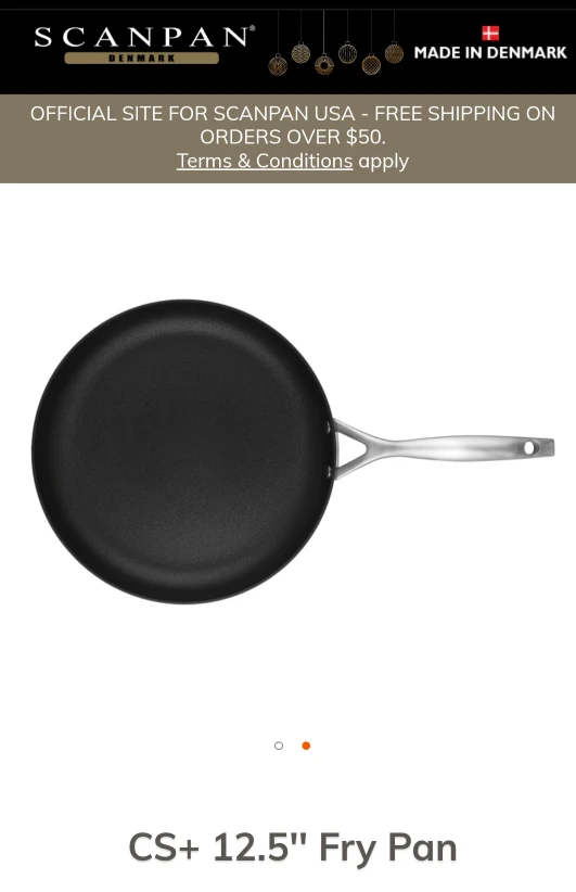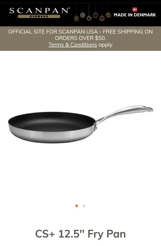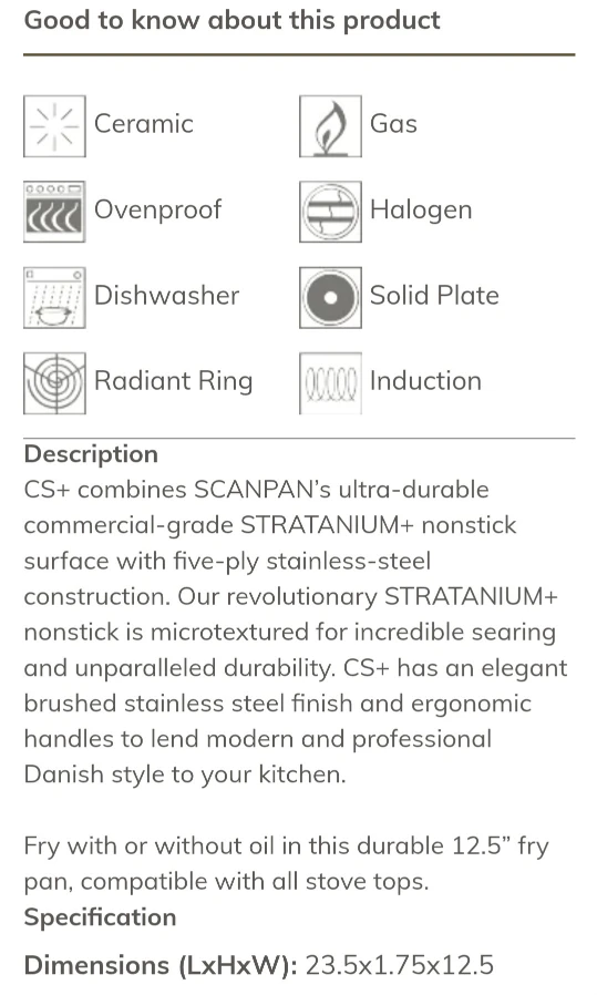 Selling a SCANPAN CS+ 12.5" fry pan! This pan features SCANPAN's ultra-durable commercial-grade STRATANIUM+ nonstick surface with five-ply stainless-steel construction. It has an elegant brushed stainless steel finish and ergonomic handles. It's compatible with all stovetops, including induction, and is oven-safe up to 500°F. Dimensions are 23.5 x 1.75 x 12.5 inches