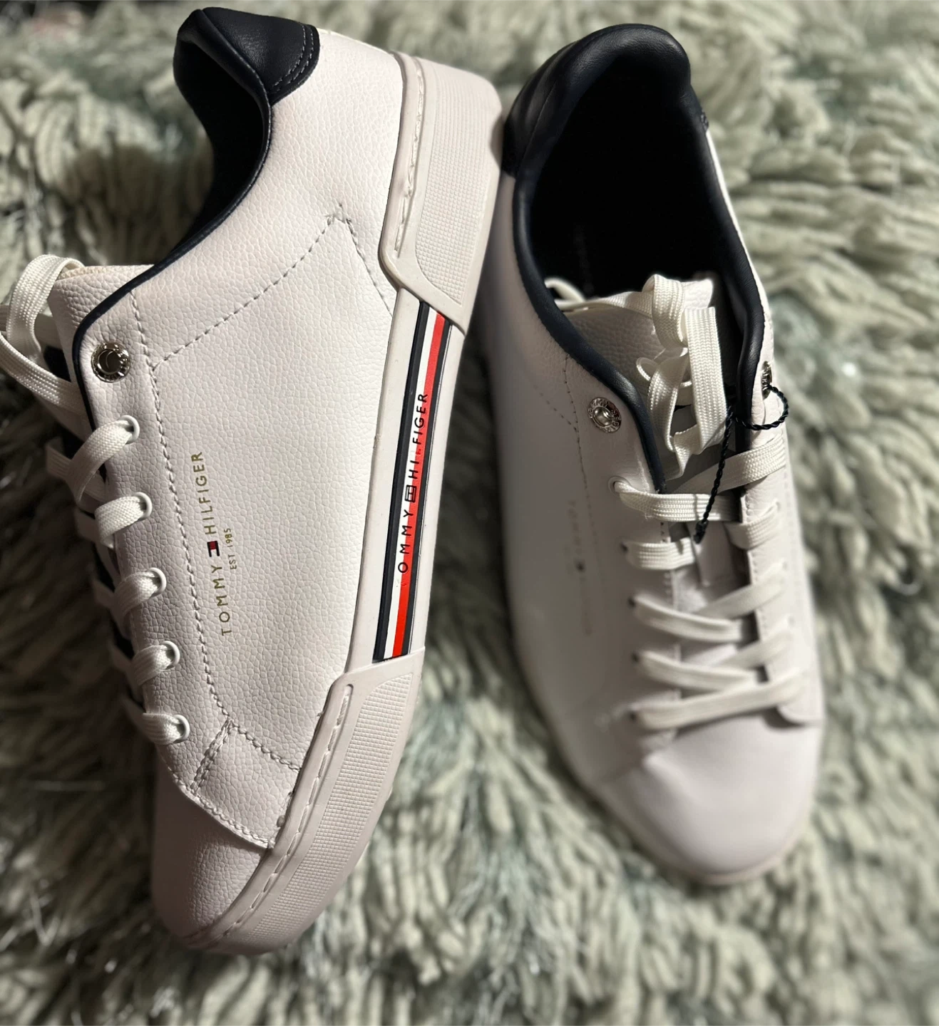 Step out in style with these Tommy Hilfiger white sneakers, a sleek and sporty addition to any wardrobe. These sneakers feature the iconic Tommy Hilfiger stripe detail and are brand new