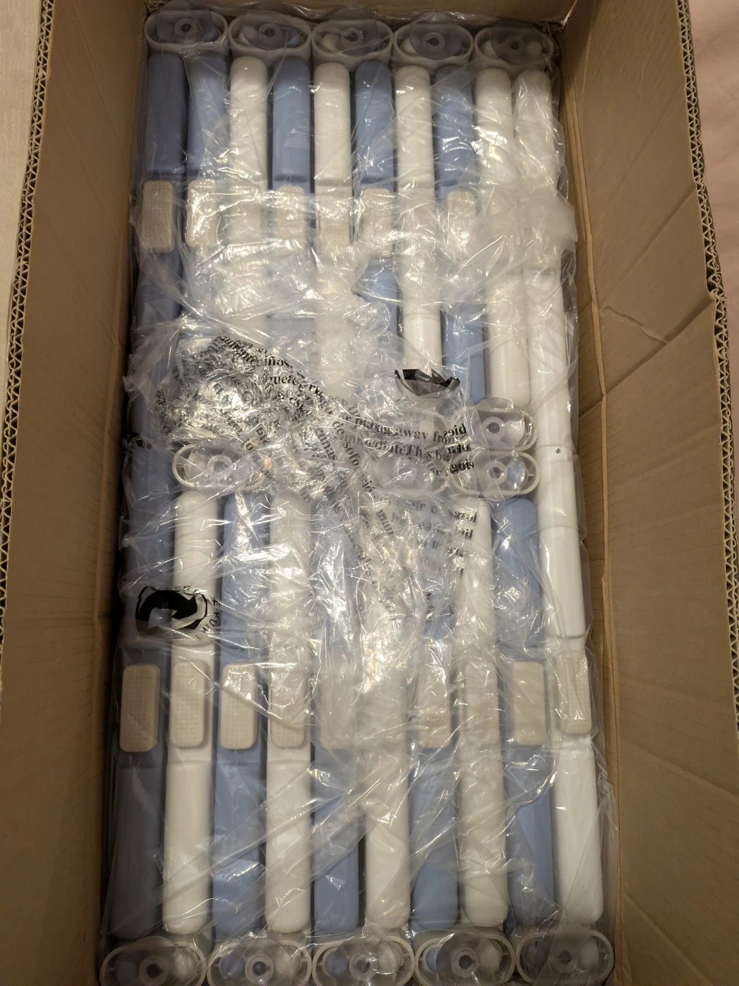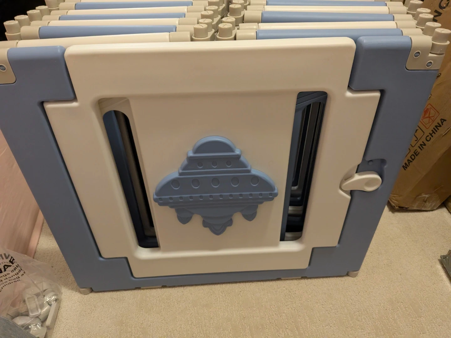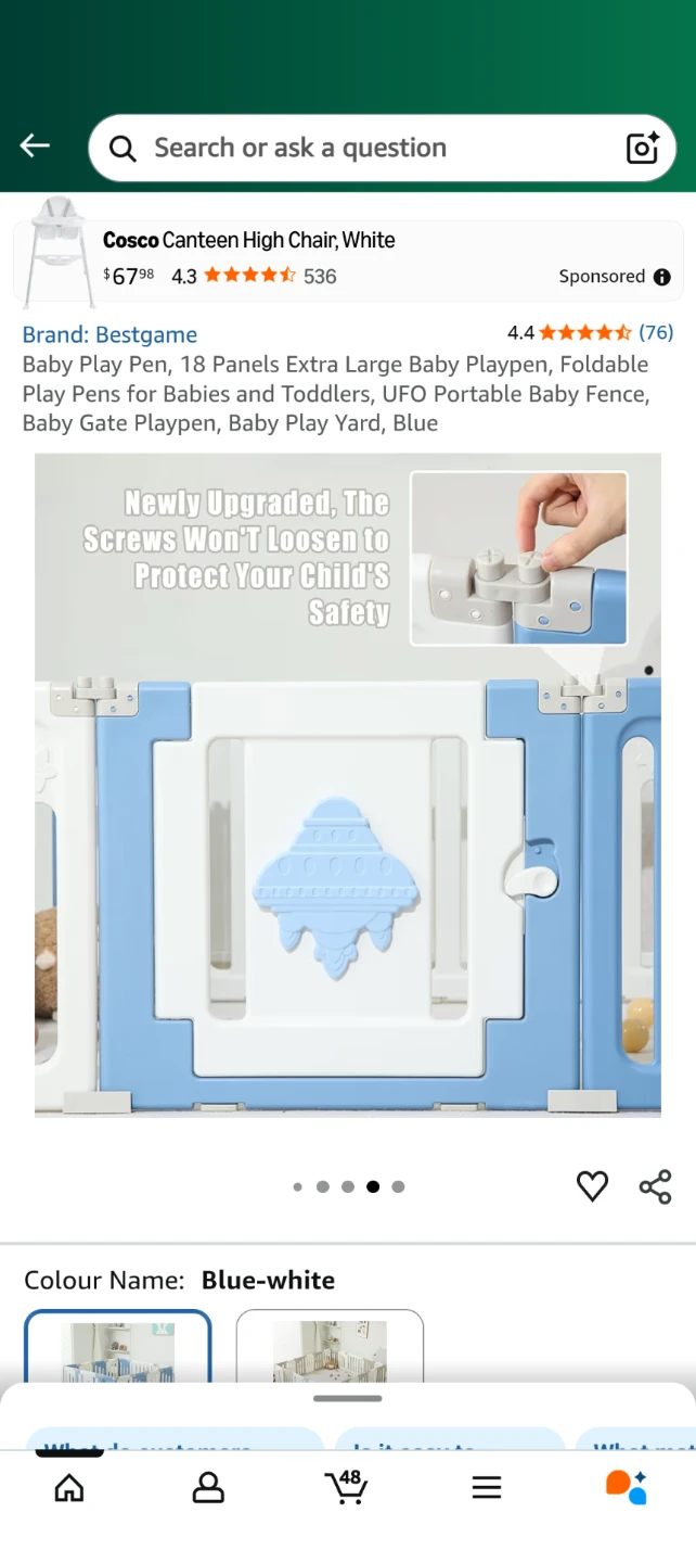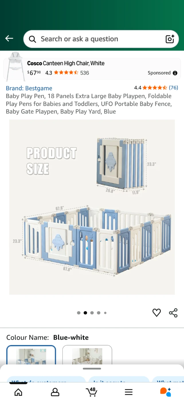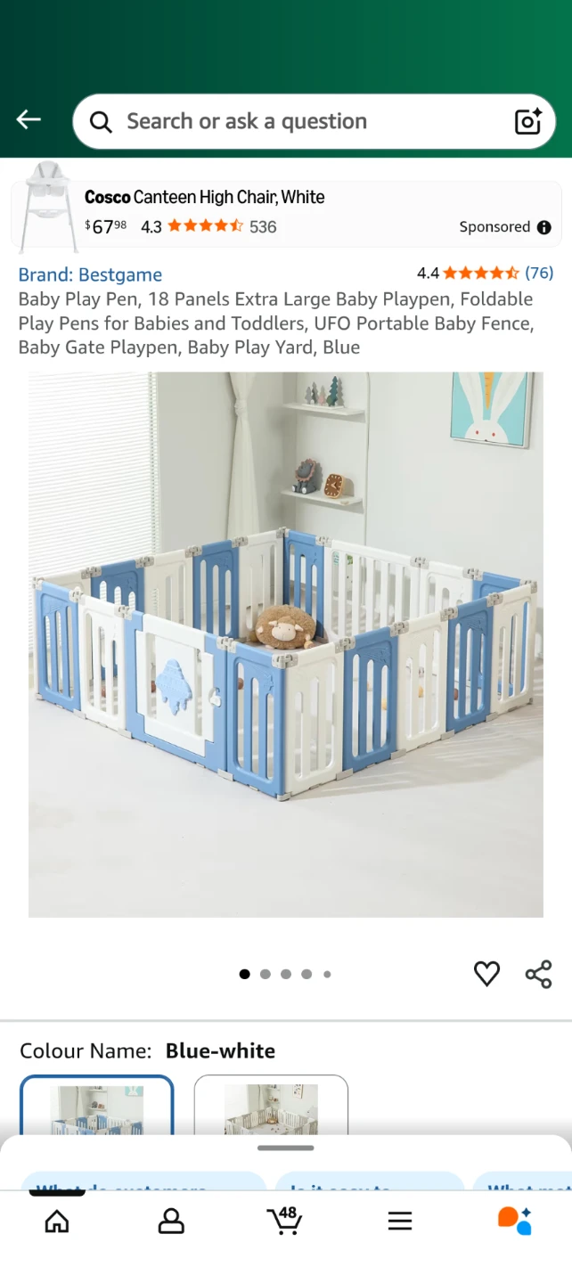 Selling a Bestgame baby play pen in blue and white. It features 18 panels, making it an extra-large space for your little ones to play safely. The playpen is foldable for easy storage and portability. It's designed with safety buckles and anti-slip mats to keep your child secure. The panels can be arranged in different shapes to fit your space!