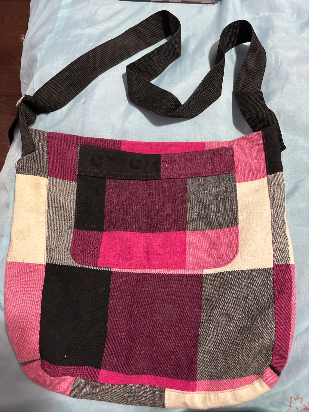 Stylish shoulder bag with a fun pink plaid pattern! It features a black strap and a handy front pocket. Perfect for carrying your essentials around town