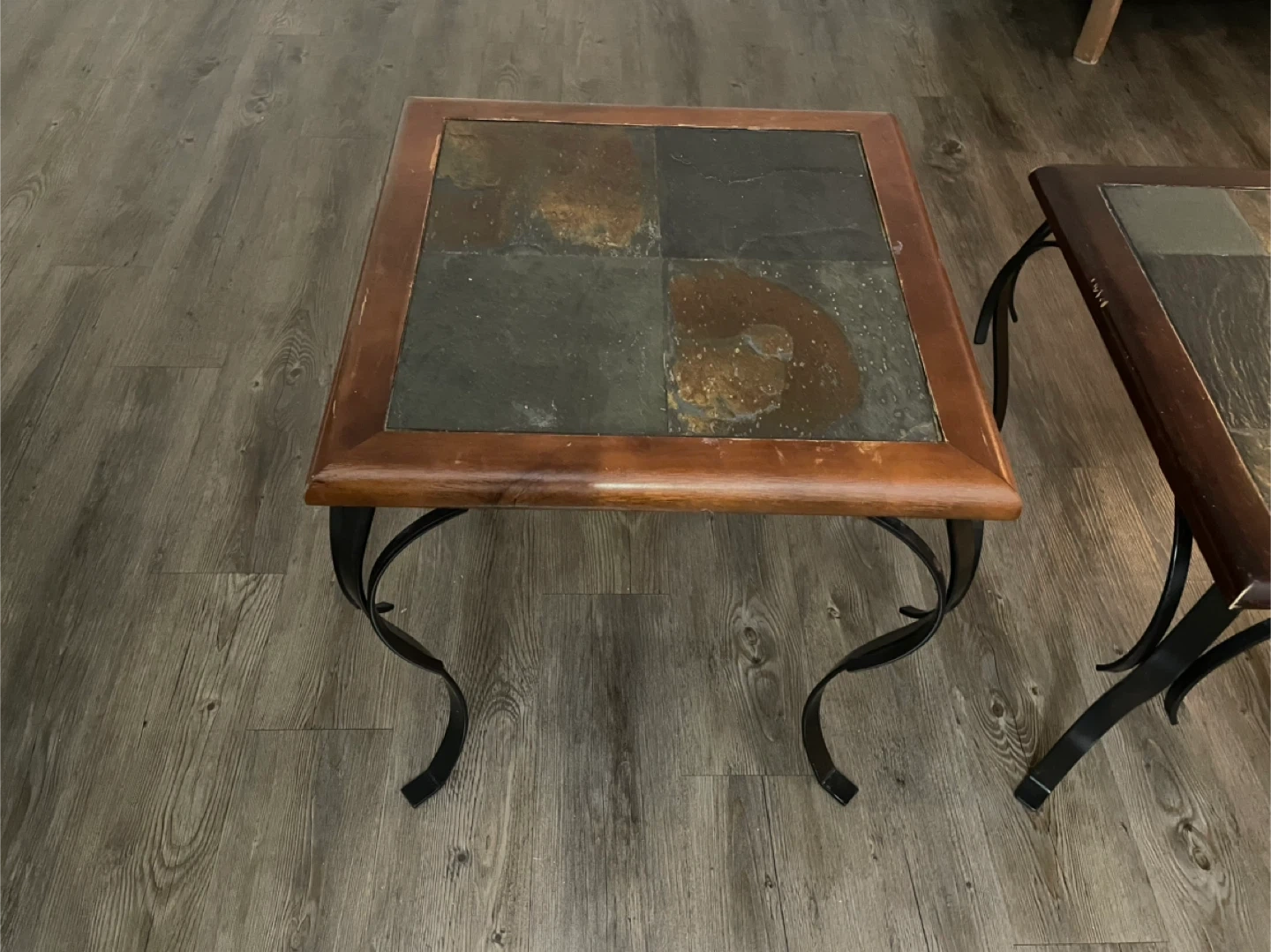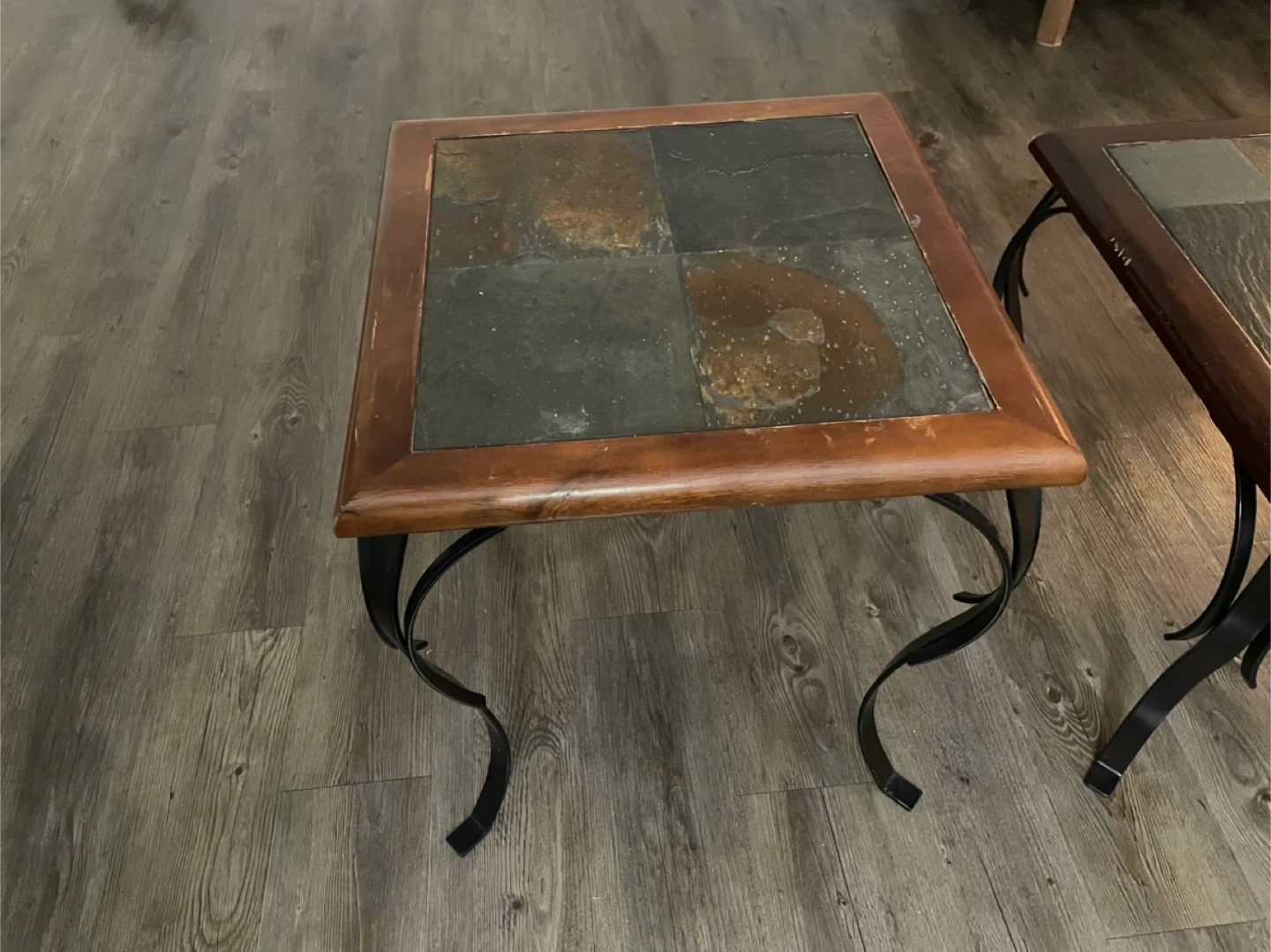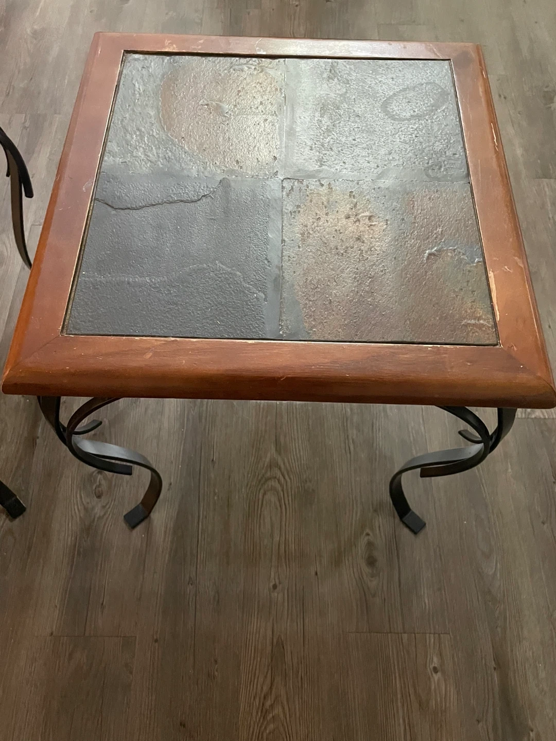 Selling a slate top end table with a wood frame and decorative metal legs. It's in good condition and would look great in any living room or bedroom!