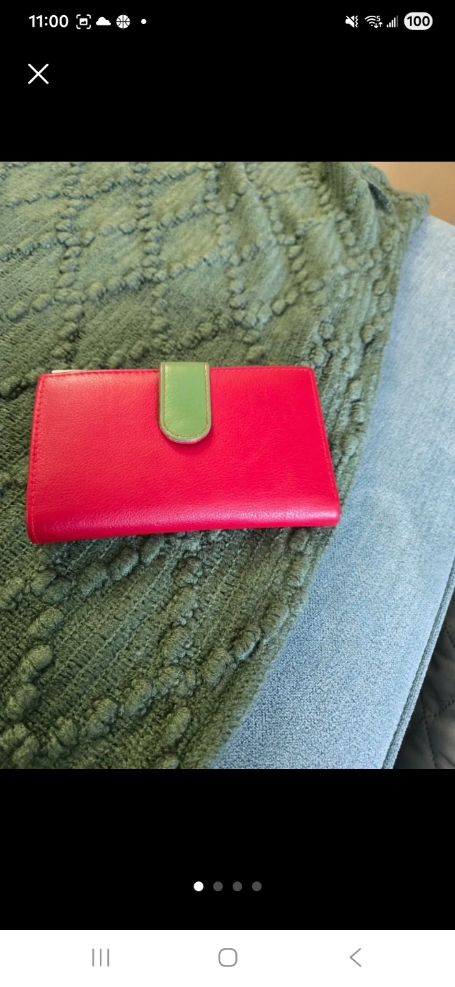I'm selling a Golunski genuine leather wallet. It features a green exterior with red and black accents on the interior. It also has RFID protection for your cards!