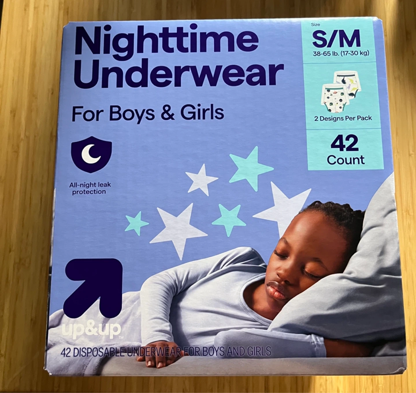 Brand New box of Up&Up Nighttime Underwear for Boys & Girls. The size is S/M, suitable for 38-65 lb (17-30 kg). Each box contains 42 disposable underwear with 2 designs per pack, offering all-night leak protection.
