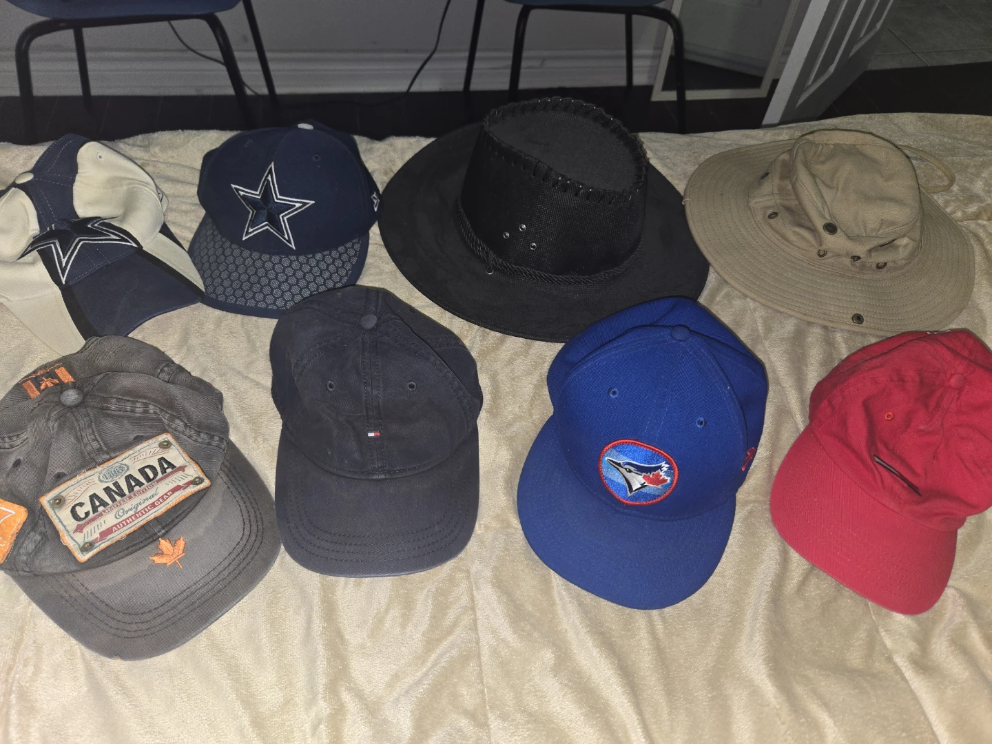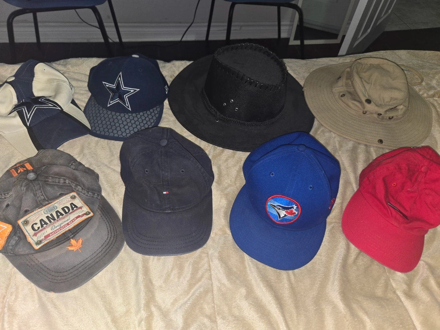 Selling a variety of baseball caps! There's a Dallas Cowboys cap, a Toronto Blue Jays cap, and a Tommy Hilfiger cap, among others. Check out the photos for details!