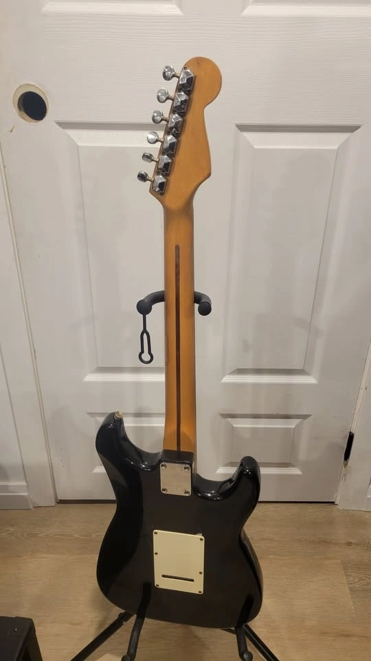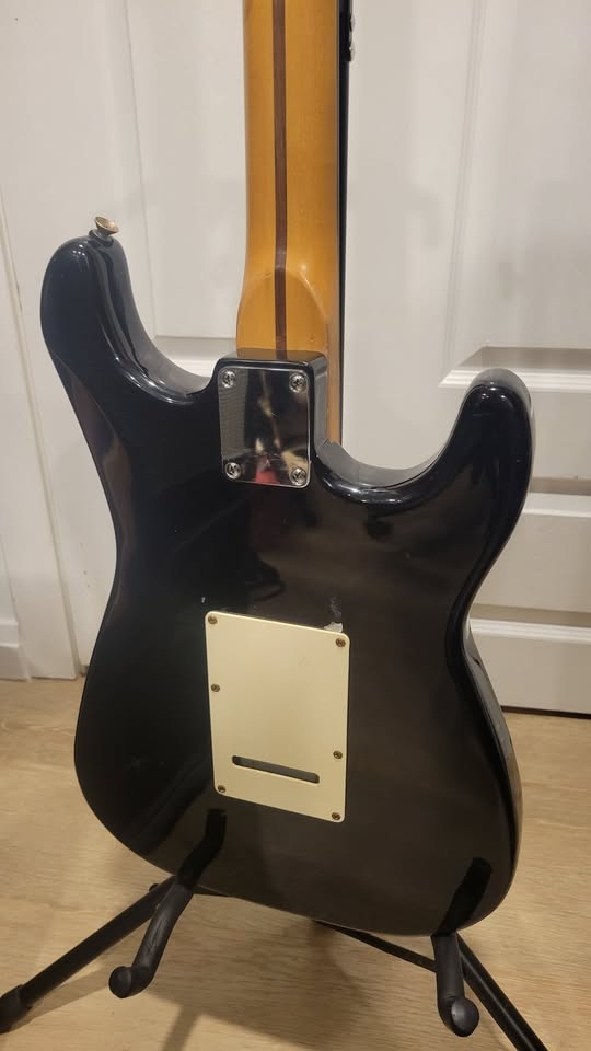 This lefty Stratocaster guitar was made in 1993 with rosewood fretboard, maple neck, tremolo bridge, 3x single-coil pickups, 5-way switch and vol/tone/tone controls.