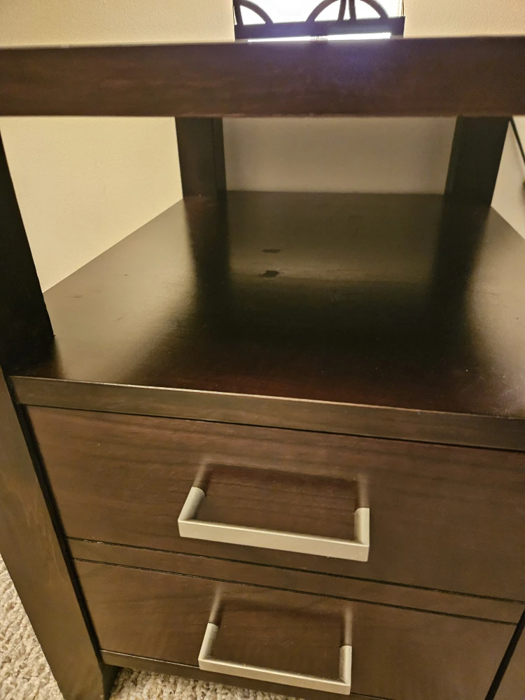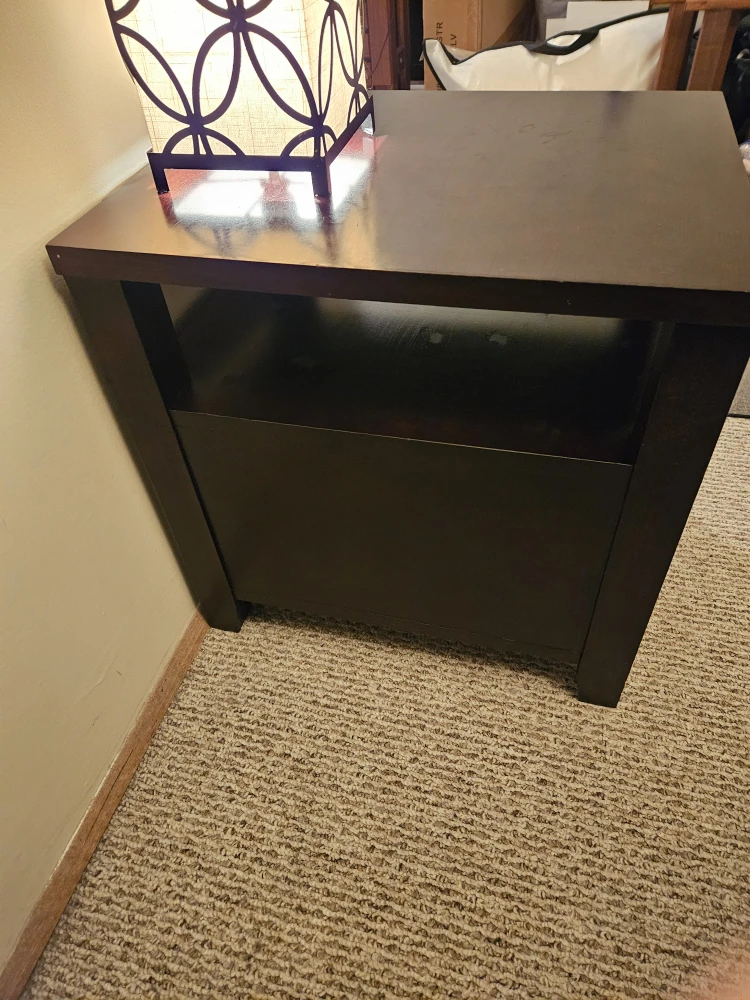 Selling a brown wood nightstand. It features one drawer and an open shelf for storage.