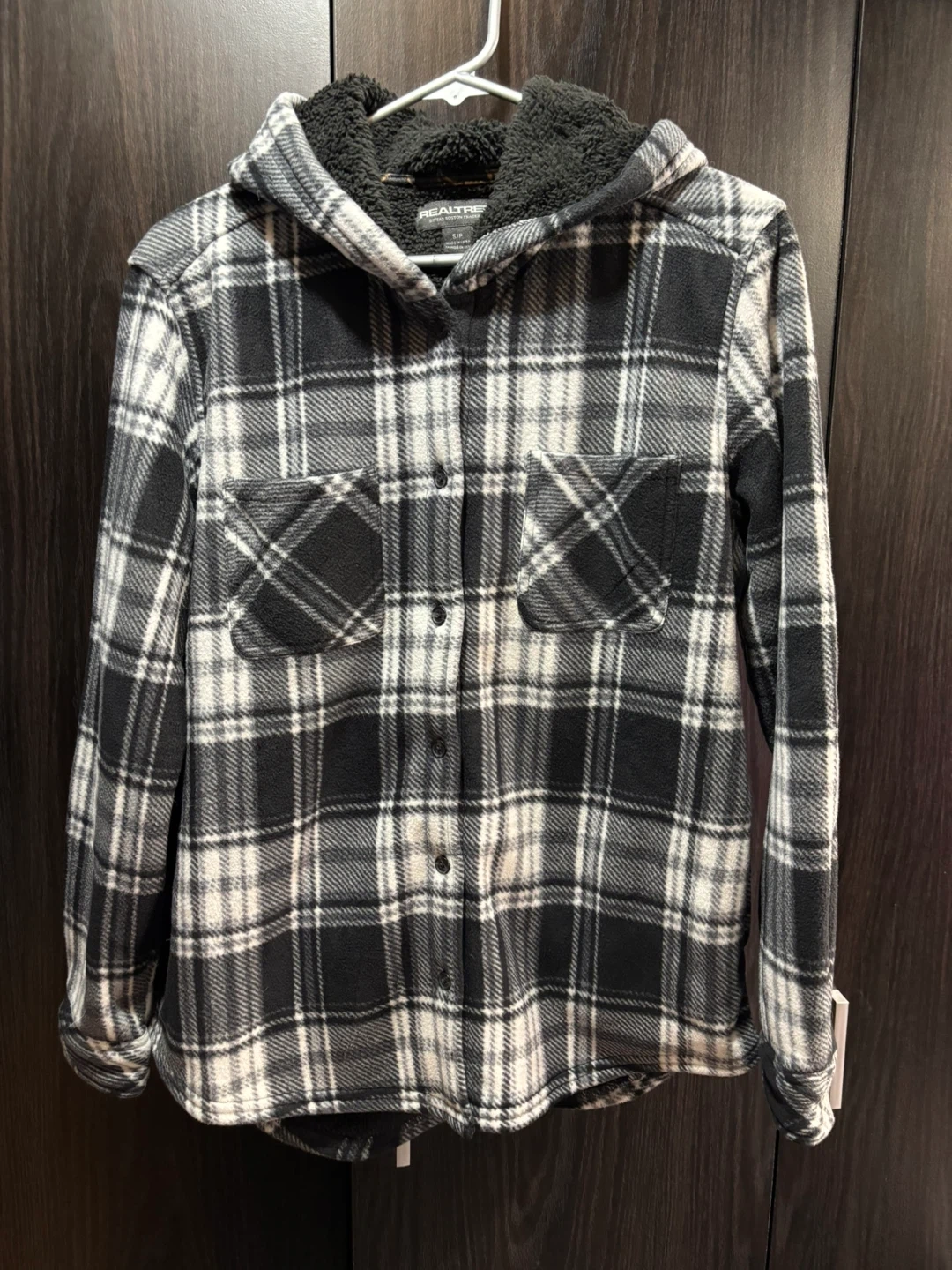 Cozy women’s Real Tree fleece with a sherpa-lined hood! It's in great condition and perfect for layering during the colder months. The size is small and it features a classic black and white plaid pattern. Has two front and side pockets with button closure.