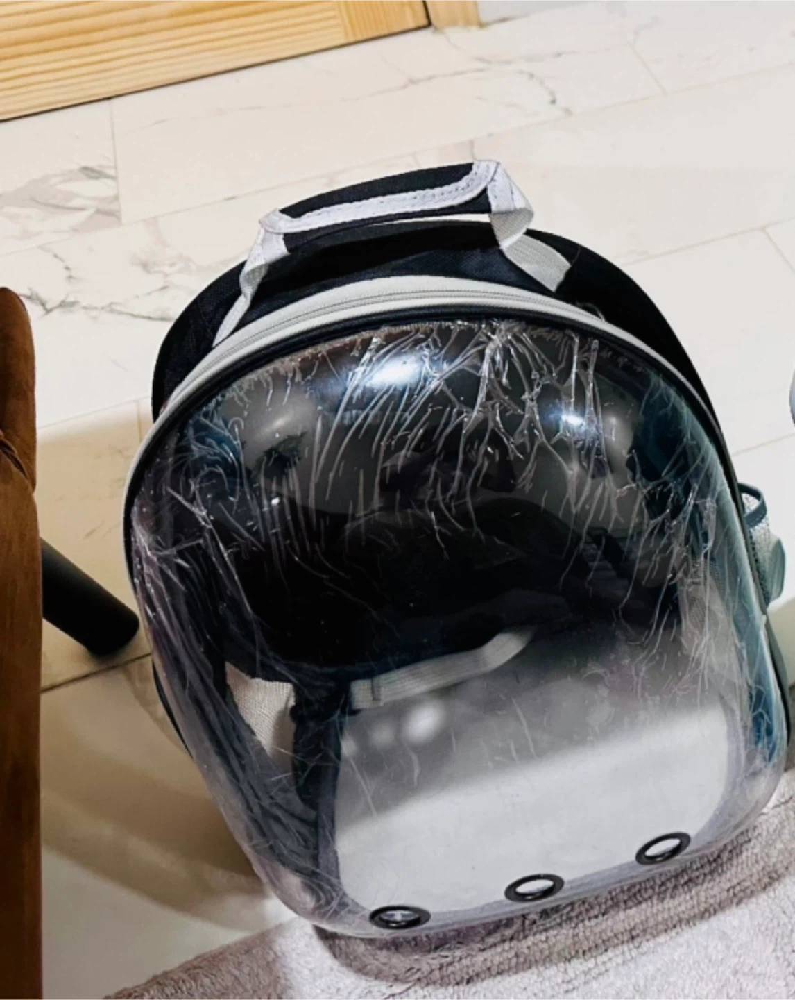 This is a pet carrier backpack. It has a clear, bubble-like window for your pet to look out of. It's in good condition and ready for your next adventure with your furry friend!