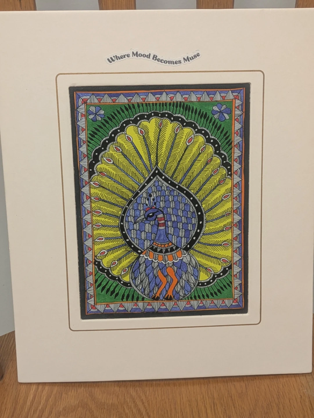 Beautiful framed art featuring a vibrant peacock design. The piece is titled "Where Mood Becomes Muse" and would add a lovely touch to any room